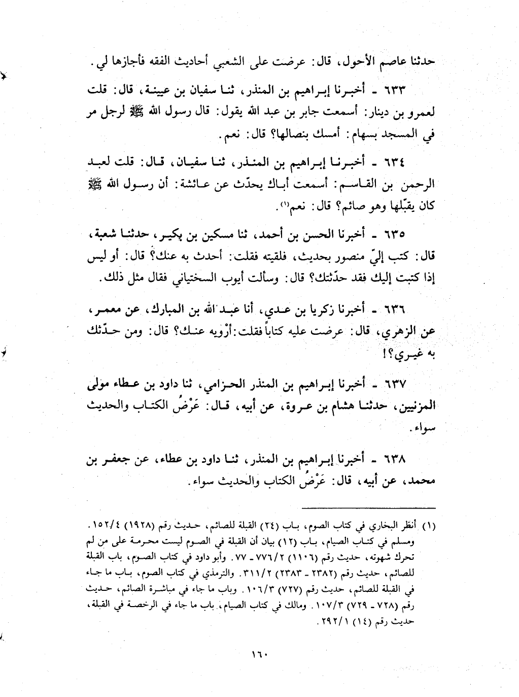 637 - أخبرنا إبراهيم بن المنذر الحزامي حدثنا داود بن عطاء مولى المزنيين حدثنا هشام بن عروة عن أبيه قال : عرض الكتاب والحديث سواء