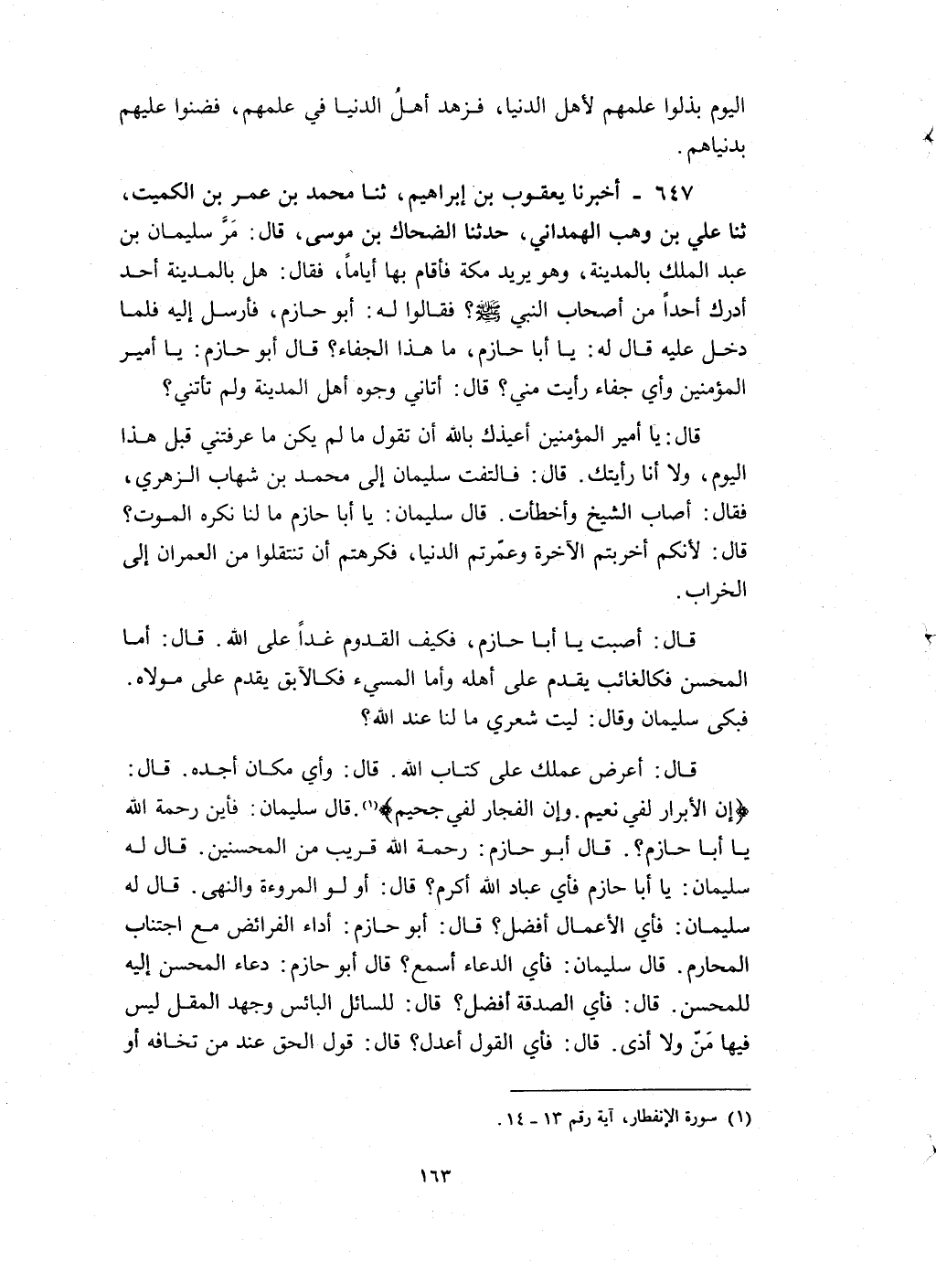 647 - أخبرنا يعقوب بن إبراهيم ثنا محمد بن عمر بن الكميت ثنا علي بن وهب الهمداني حدثنا الضحاك بن موسى قال : مر سليمان بن عبد الملك بالمدينة وهو يريد مكة فأقام بها أياما فقال هل بالمدينة أحد أدرك أحدا من أصحاب النبي صلى الله عليه و سلم فقالوا له أبو حازم فأرسل إليه فلما دخل عليه قال له يا أبا حازم ما هذا الجفاء قال أبو حازم يا أمير المؤمنين وأي جفاء رأيت مني قال أتاني وجوه أهل المدينة ولم تأتني قال يا أمير المؤمنين أعيذك بالله ان تقول ما لم يكن ما عرفتني قبل هذا اليوم ولا أنا رأيتك قال فالتفت سليمان إلى محمد بن شهاب الزهري فقال أصاب الشيخ وأخطأت قال سليمان يا أبا حازم مالنا نكره الموت قال لأنكم أخربتم الآخرة وعمرتم الدنيا فكرهتم ان تنتقلوا من العمران إلى الخراب قال أصبت يا أبا حازم فكيف القدوم غدا على الله قال أما المحسن فكالغائب يقدم على أهله واما المسيء فكالآبق يقدم على مولاه فبكى سليمان وقال ليت شعري مالنا عند الله قال اعرض عملك على كتاب الله قال وأي مكان أجده قال { إن الأبرار لفي نعيم وإن الفجار لفي جحيم } قال سليمان فأين رحمة الله يا أبا حازم قال أبو حازم رحمة الله قريب من المحسنين قال له سليمان يا أبا حازم فأي عباد الله أكرم قال أو لو المروءة والنهى قال له سليمان فأي الأعمال أفضل قال أبو حازم أداء الفرائض مع اجتناب المحارم قال سليمان فأي الدعاء أسمع قال أبو حازم دعاء المحسن إليه للمحسن قال فأي الصدقة أفضل قال للسائل البائس وجهد المقل ليس فيها من ولا أذى قال فأي القول أعدل قال قول الحق عند من تخافه أو [ ص 164 ] ترجوه قال فأي المؤمنين أكيس قال رجل عمل بطاعة الله ودل الناس عليها قال فأي المؤمنين أحمق قال رجل انحط في هوى أخيه وهو ظالم فباع آخرته بدنيا غيره قال له سليمان أصبت فما تقول فيما نحن فيه قال يا أمير المؤمنين أو تعفني قال له سليمان لا ولكن نصيحة تلقيها إلي قال يا أمير المؤمنين ان آباءك قهروا الناس بالسيف وأخذوا هذا الملك عنوة على غير مشورة من المسلمين ولا رضا لهم حتى قتلوا منهم مقتله عظيمة فقد ارتحلوا عنها فلو شعرت ما قالوه وما قيل لهم فقال له رجل من جلسائه بئس ما قلت يا أبا حازم قال أبو حازم كذبت ان الله أخذ ميثاق العلماء ليبيننه للناس ولا يكتمونه قال له سليمان فكيف لنا ان نصلح قال تدعون التصلف وتمسكون بالمروءة وتقسمون بالسوية قال له سليمان كيف لنا بالمأخذ به قال أبو حازم تأخذه من حله وتضعه في أهله قال له سليمان هل لك يا أبا حازم ان تصحبنا فتصيب منا ونصيب منك قال أعوذ بالله قال له سليمان ولم ذاك قال أخشى أن أركن إليكم شيئا قليلا فيذيقني الله ضعف الحياة وضعف الممات قال له سليمان أرفع إلينا حوائجك قال تنجيني من النار وتدخلني الجنة قال سليمان ليس ذاك إلي قال أبو حازم فمالي إليك حاجة غيرها قال فادع لي قال أبو حازم اللهم ان كان سليمان وليك فيسره لخير الدنيا والآخرة وان كان عدوك فخذ بناصيته إلى ما تحب وترضى قال له سليمان قط قال أبو حازم قد أوجزت وأكثرت ان كنت من أهله وان لم تكن من أهله فما ينفعني ان أرمي عن قوس ليس لها وتر قال له سليمان أوصني قال سأوصيك وأوجز عظم ربك ونزهه ان يراك حيث نهاك أو يفقدك حيث أمرك فلما خرج من عنده بعث إليه بمائة دينار وكتب إليه ان أنفقها ولك [ ص 165 ] عندي مثلها كثير قال فردها عليه وكتب إليه يا أمير المؤمنين أعيذك بالله ان يكون سؤالك إياي هزلا أو ردي عليك بذل وما أرضاها لك فكيف أرضاها لنفسي وكتب إليه ان موسى بن عمران لما { ورد ماء مدين وجد } عليها رعاء { يسقون ووجد من دونهم } جاريتين تزودان فسألهما فقالتا { لا نسقي حتى يصدر الرعاء وأبونا شيخ كبير فسقى لهما ثم تولى إلى الظل فقال رب إني لما أنزلت إلي من خير فقير } وذلك انه كان جائعا خائفا لا يأمن فسأل ربه ولم يسأل الناس فلم يفطن الرعاء وفطنت الجاريتان فلما رجعتا إلى أبيهما أخبرتاه بالقصة وبقوله فقال أبوهما وهو شعيب هذا رجل جائع فقال لإحداهما فادعيه فلما أتته عظمته وغطت وجهها وقالت { إن أبي يدعوك ليجزيك أجر ما سقيت لن