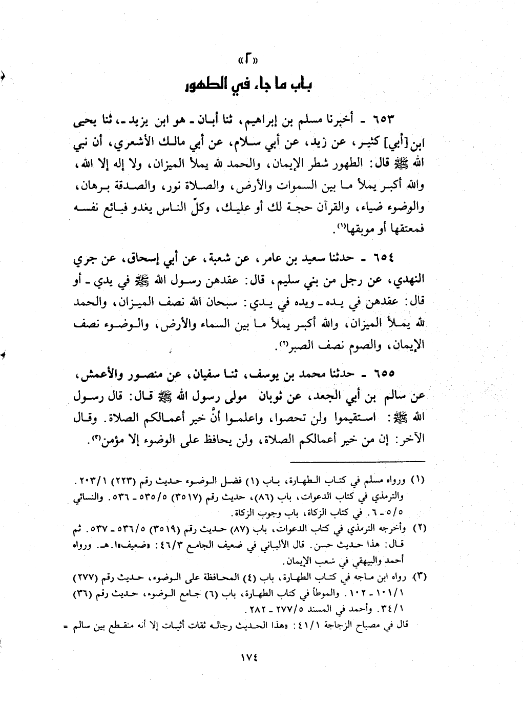 653 - أخبرنا مسلم بن إبراهيم ثنا أبان هو بن يزيد ثنا يحيى بن أبي كثير عن زيد عن أبي سلام عن أبي مالك الأشعري ان نبي الله صلى الله عليه و سلم قال : الطهور شطر الإيمان والحمد لله يملأ الميزان ولا إله الا الله والله أكبر يملأ ما بين السماوات والأرض والصلاة نور والصدقة برهان والوضوء ضياء والقرآن حجة لك أو عليك وكل الناس يغدوا فبائع نفسه فمعتقها أو موبقها