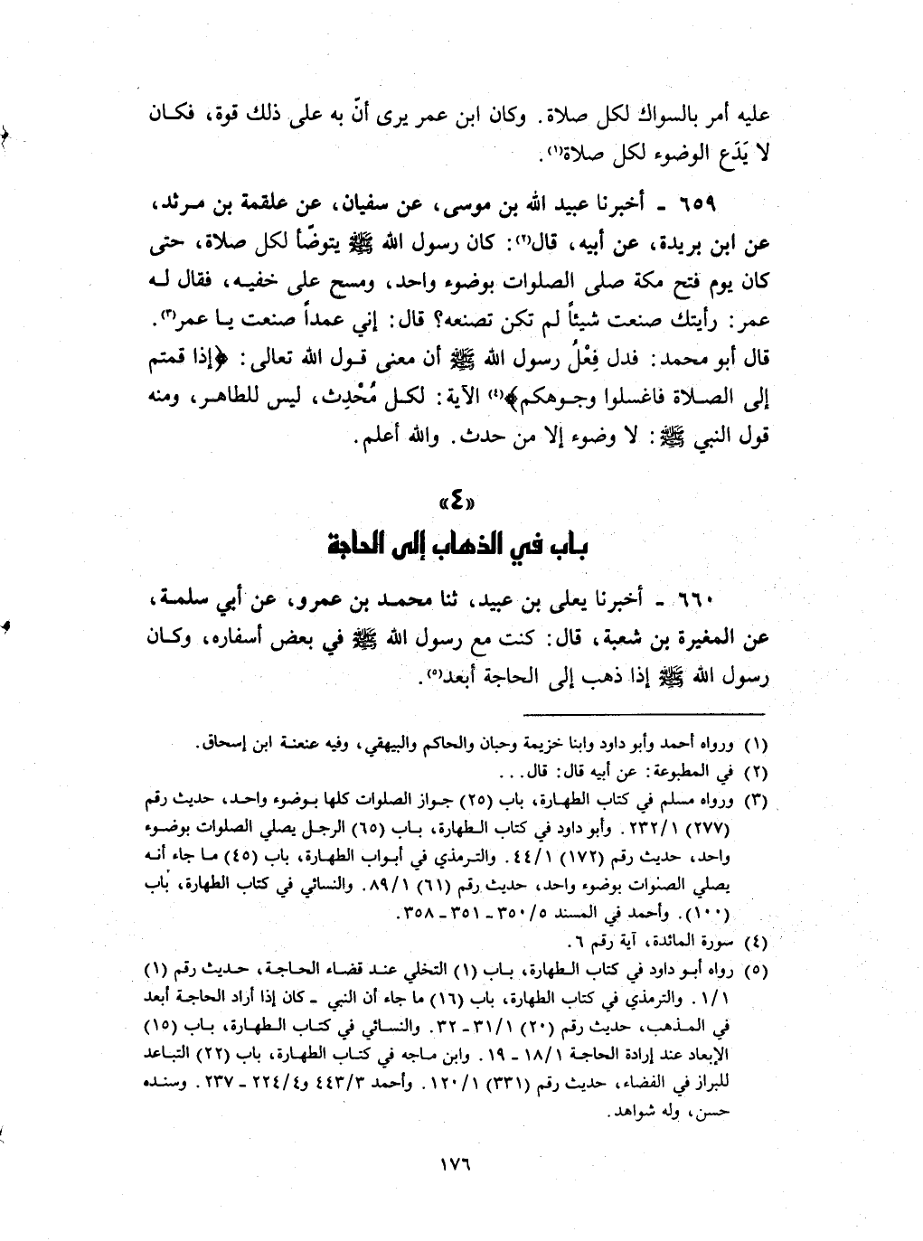 660 - أخبرنا يعلى بن عبيد ثنا محمد بن عمرو عن أبي سلمة عن المغيرة بن شعبة قال : كنت مع رسول الله صلى الله عليه و سلم في بعض أسفاره وكان رسول الله صلى الله عليه و سلم إذا ذهب إلى الحاجة أبعد