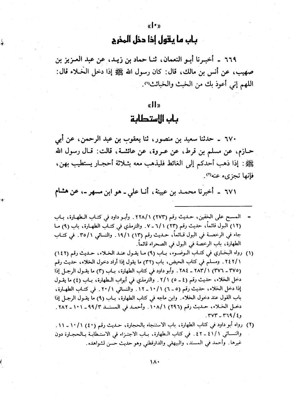 669 - أخبرنا أبو النعمان ثنا حماد بن زيد عن عبد العزيز بن صهيب عن أنس بن مالك قال : كان رسول الله صلى الله عليه و سلم إذا دخل الخلاء قال اللهم إني أعوذ بك من الخبث والخبائث