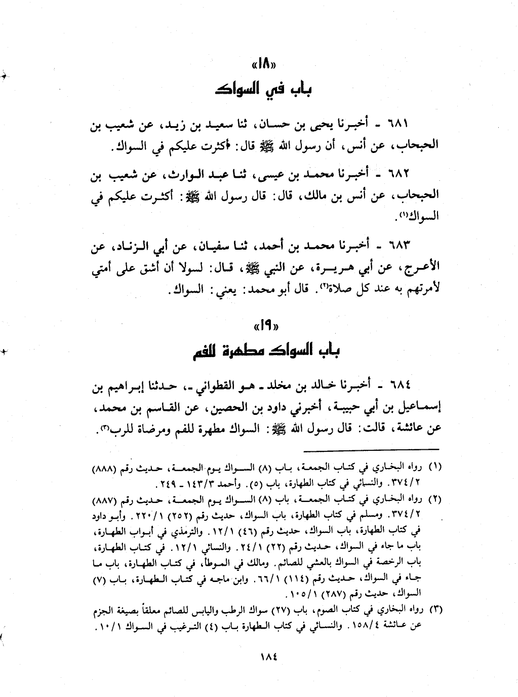 683 - أخبرنا محمد بن أحمد ثنا سفيان عن أبي الزناد عن الأعرج عن أبي هريرة عن النبي صلى الله عليه و سلم قال : لولا ان أشق على أمتي لأمرتهم به عند كل صلاة قال أبو محمد يعني السواك