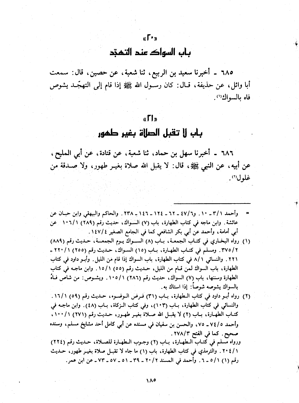 685 - أخبرنا سعيد بن الربيع ثنا شعبة عن حصين قال سمعت أبا وائل عن حذيفة قال : كان رسول الله صلى الله عليه و سلم إذا قام إلى التهجد يشوص فاه بالسواك