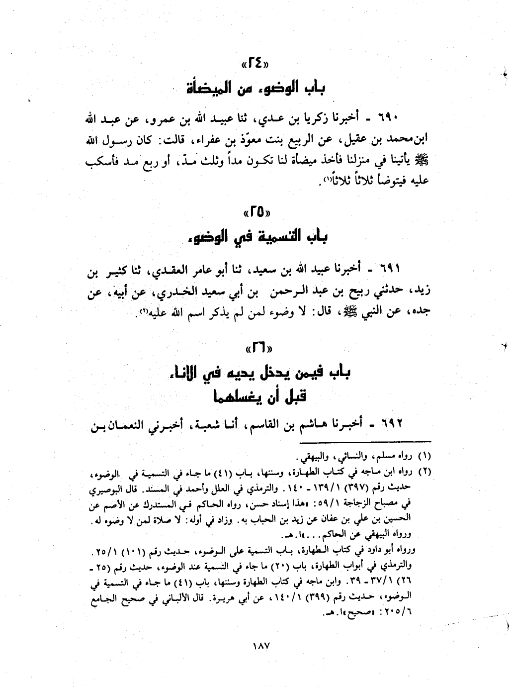 690 - أخبرنا زكريا بن عدي ثنا عبيد الله بن عمرو عن عبد الله بن محمد بن عقيل عن الربيع بنت معوذ بن عفراء قالت : كان رسول الله صلى الله عليه و سلم يأتينا في منزلنا فأخذ ميضأة لنا تكون مدا وثلث مد أو ربع مد فأسكب عليه فيتوضأ ثلاثا ثلاثا