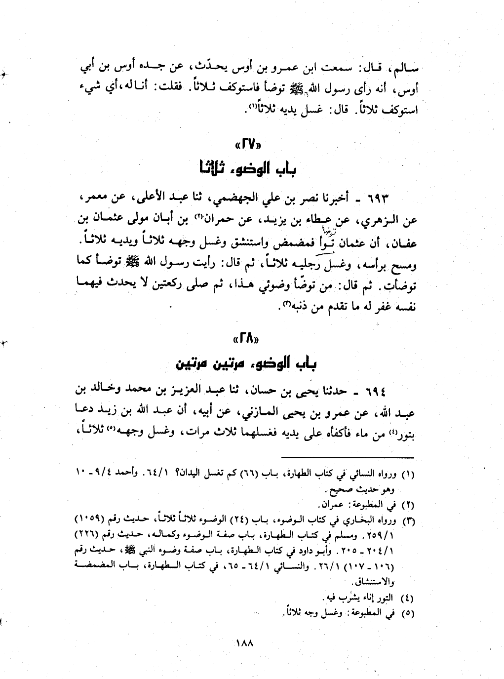693 - أخبرنا نصر بن علي الجهضمي ثنا عبد الأعلى عن معمر عن الزهري عن عطاء بن يزيد عن حمران بن أبان مولى عثمان بن عفان : ان عثمان توضأ فمضمض واستنشق وغسل وجهه ثلاثا ويديه ثلاثا ومسح برأسه وغسل رجليه ثلاثا ثم قال رأيت رسول الله صلى الله عليه و سلم توضأ كما توضأت ثم قال من توضأ وضوئي هذا ثم صلى ركعتين لا يحدث فيهما نفسه غفر له ما تقدم من ذنبه