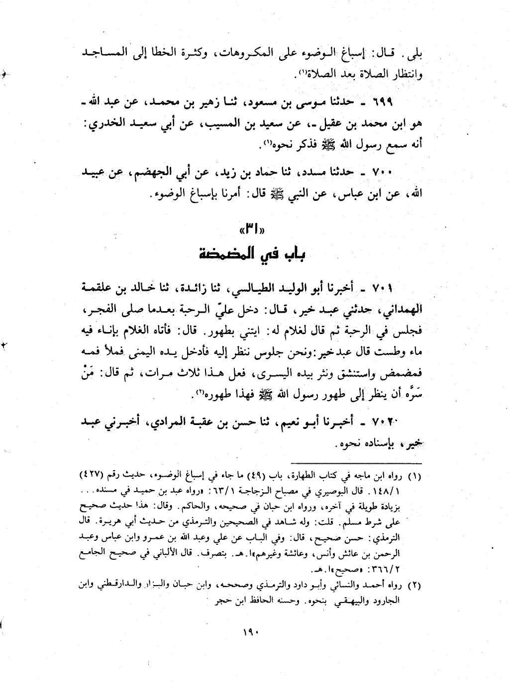 701 - أخبرنا أبو الوليد الطيالسي ثنا زائدة ثنا خالد بن علقمة الهمداني حدثني عبد خير قال : دخل علي الرحبة بعد ما صلى الفجر فجلس في الرحبة ثم قال لغلام له ايتني بطهور قال فاتاه الغلام بإناء فيه ماء وطست قال عبد خير ونحن جلوس ننظر إليه فأدخل يده اليمنى فملأ فمه فمضمض واستنشق ونثر بيده اليسرى فعل هذا ثلاث مرات ثم قال من سره ان ينظر إلى طهور رسول الله صلى الله عليه و سلم فهذا طهوره