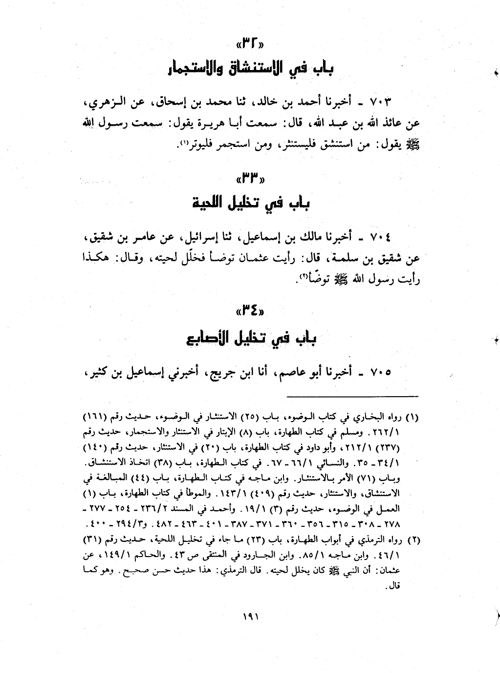 704 - أخبرنا مالك بن إسماعيل ثنا إسرائيل عن عامر بن شقيق عن شقيق بن سلمة قال : رأيت عثمان توضأ فخلل لحيته وقال هكذا رأيت رسول الله صلى الله عليه و سلم توضأ