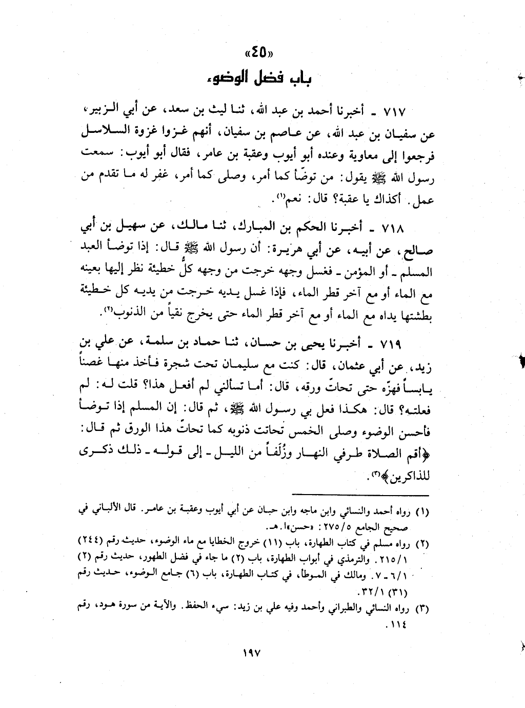 717 - أخبرنا أحمد بن عبد الله ثنا ليث بن سعد عن أبي الزبير عن سفيان بن عبد الله عن عاصم بن سفيان : انهم غزوا غزوة السلاسل فرجعوا إلى معاوية وعنده أبو أيوب وعقبة بن عامر فقال أبو أيوب سمعت رسول الله صلى الله عليه و سلم يقول من توضأ كما أمر وصلى كما أمر غفر له ما تقدم من عمل أكذاك يا عقبة قال نعم