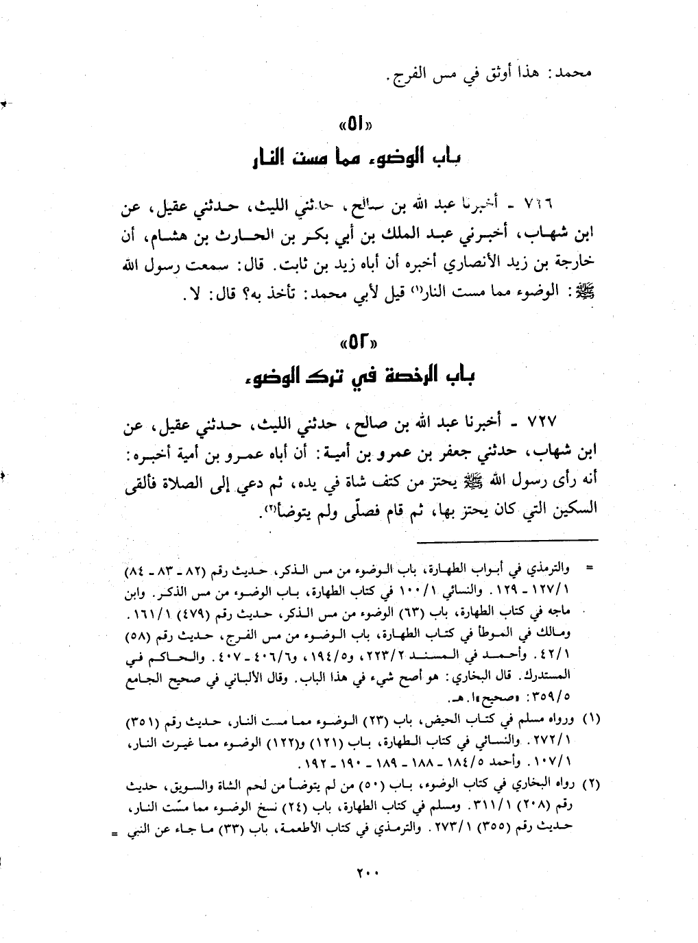726 - أخبرنا عبد الله بن صالح حدثني الليث حدثني عقيل عن بن شهاب أخبرني عبد الملك بن أبي بكر بن الحارث بن هشام ان خارجة بن زيد الأنصاري أخبره ان أباه زيد بن ثابت قال : سمعت رسول الله صلى الله عليه و سلم الوضوء مما مست النار قيل لأبي محمد تأخذ به قال لا