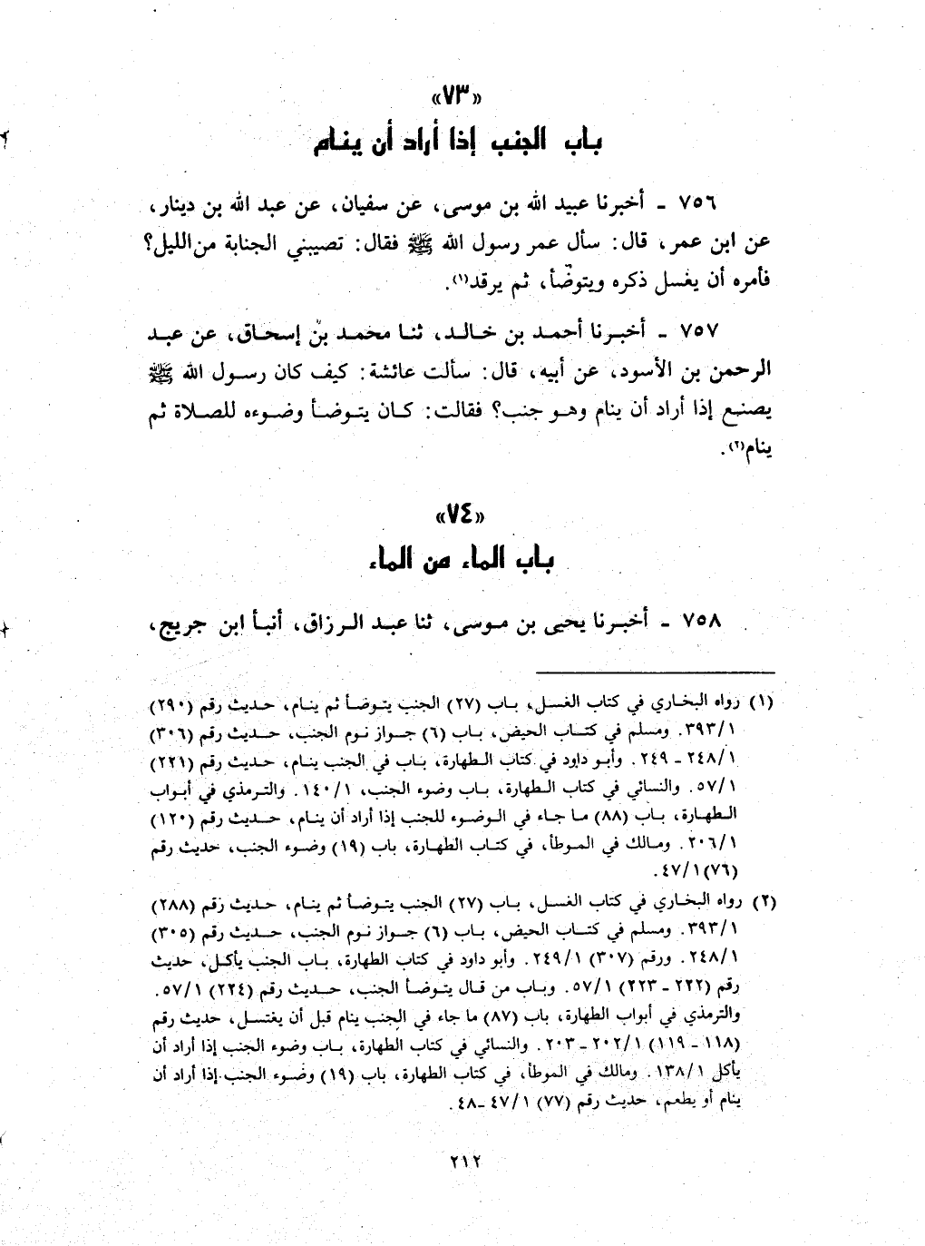 757 - أخبرنا أحمد بن خالد ثنا محمد بن إسحاق عن عبد الرحمن بن الأسود عن أبيه قال : سألت عائشة كيف كان رسول الله صلى الله عليه و سلم يصنع إذا أراد ان ينام وهو جنب فقالت كان يتوضأ وضوءه للصلاة ثم ينام