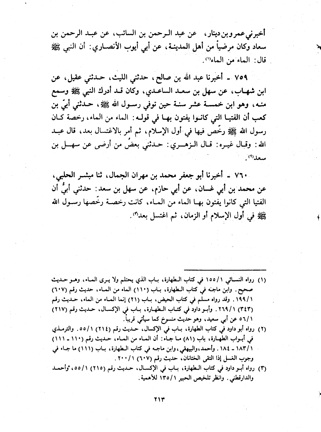 760 - أخبرنا أبو جعفر محمد بن مهران الجمال ثنا مبشر الحلبي عن محمد بن أبي غسان عن أبي حازم عن سهل بن سعد حدثني أبي : ان الفتيا التي كانوا يفتون بها الماء من الماء كانت رخصة رخصها رسول الله صلى الله عليه و سلم في أول الإسلام أو الزمان ثم اغتسل بعد