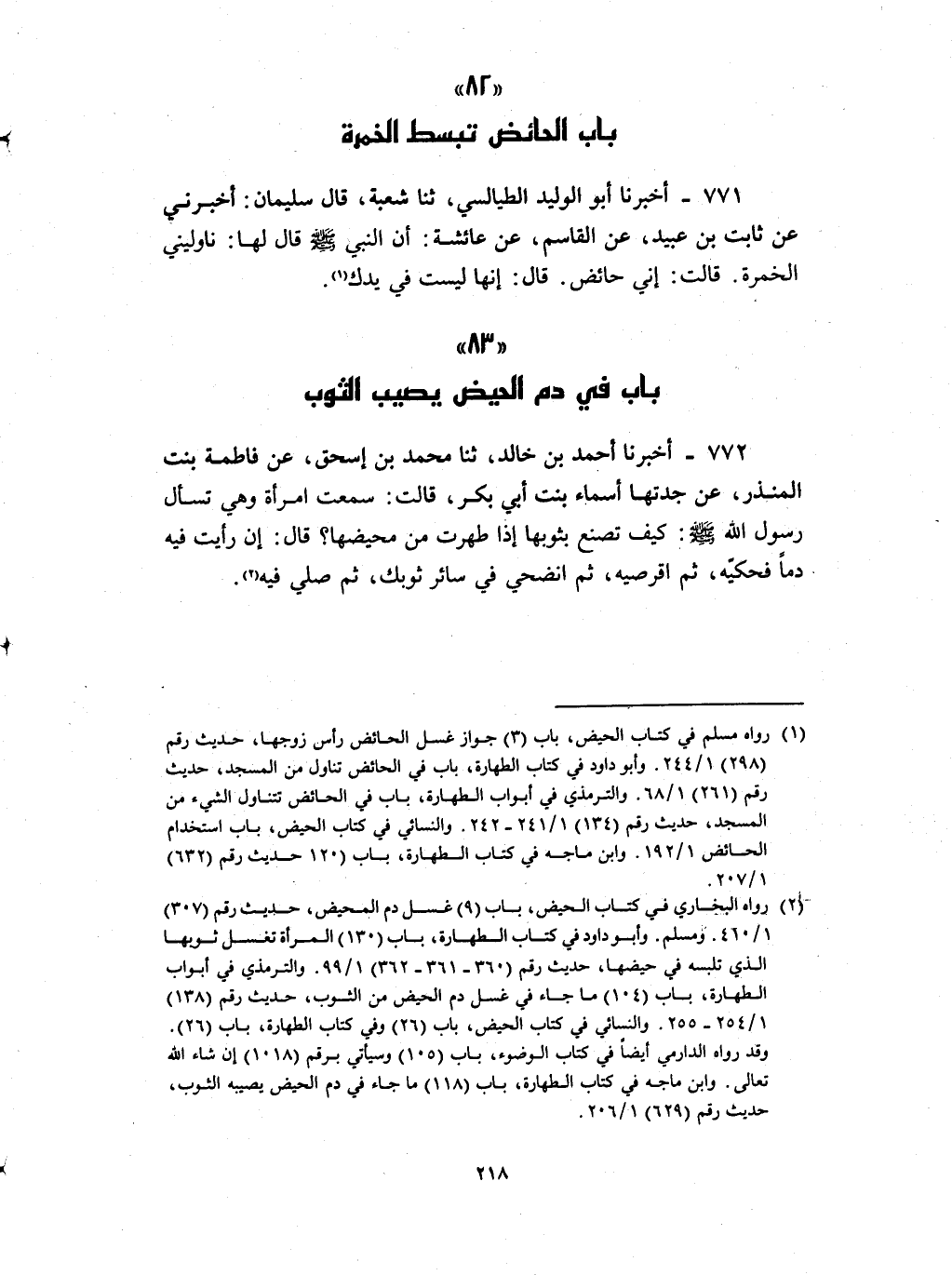 771 - أخبرنا أبو الوليد الطيالسي ثنا شعبة قال سليمان أخبرني عن ثابت بن عبيد عن القاسم عن عائشة : ان النبي صلى الله عليه و سلم قال لها ناوليني الخمرة قالت اني حائض قال إنها ليست في يدك