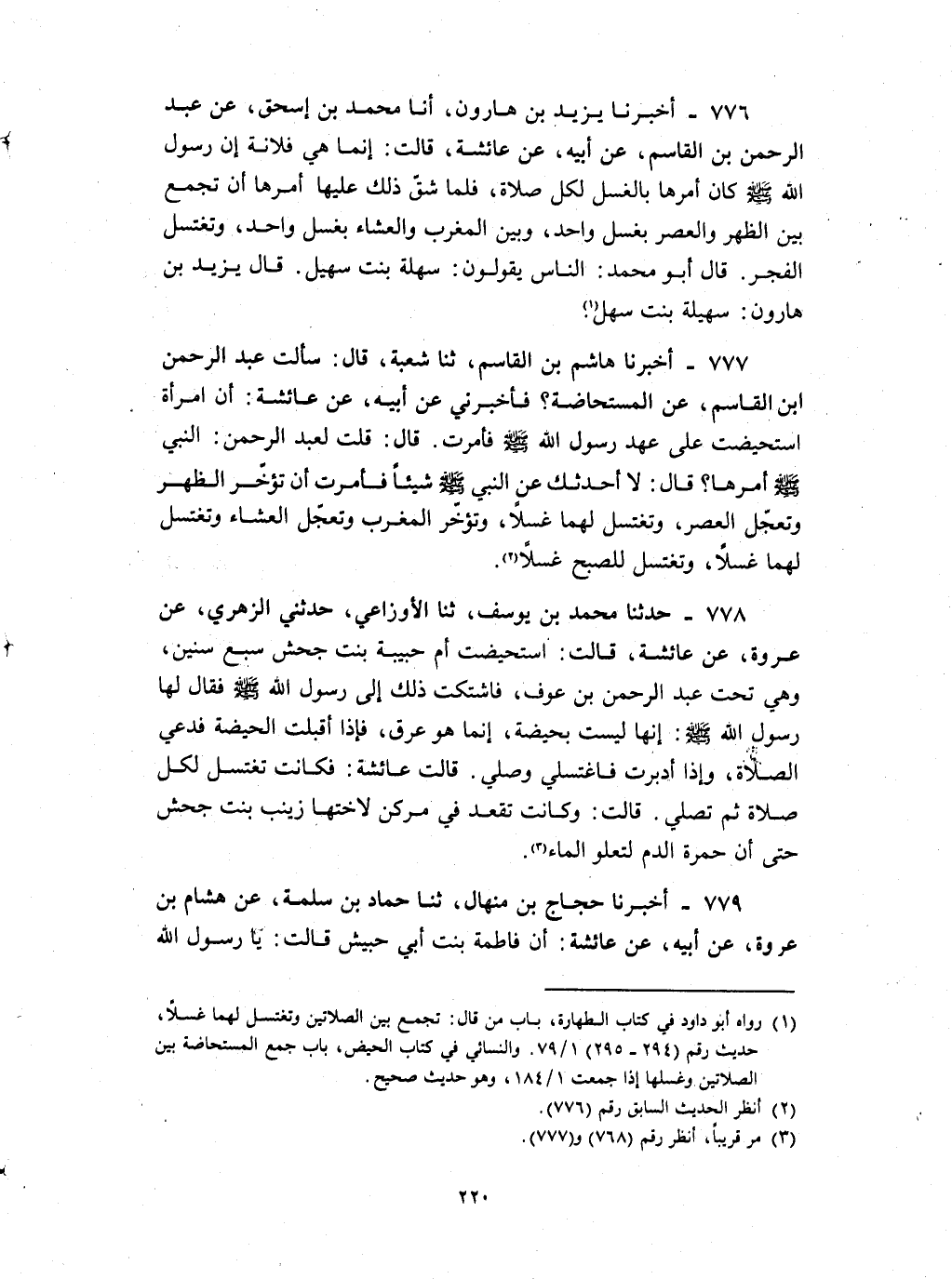 779 - أخبرنا حجاج بن منهال ثنا حماد بن سلمة عن هشام بن عروة عن أبيه عن عائشة : ان فاطمة بنت أبي حبيش قالت يا رسول الله إني امرأة استحاض أفأترك الصلاة قال لا إنما ذلك عرق وليست بالحيضة فإذا أقبلت الحيضة فاتركي الصلاة فإذا ذهب قدرها فاغسلي عنك الدم وتوضئي وصلي قال هشام فكان أبي يقول تغتسل غسل الأول ثم ما يكون بعد ذلك فإنها تطهر وتصلي