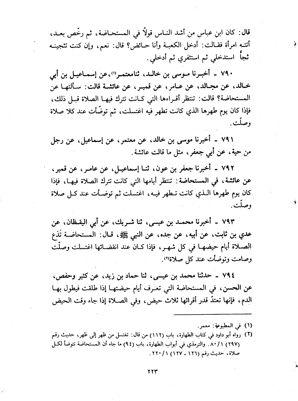794 - حدثنا محمد بن عيسى ثنا حماد بن زيد عن كثير وحفص عن الحسن : في المستحاضة التي تعرف أيام حيضتها إذا طلقت فيطول بها الدم فإنها تعتد قدر إقرائها ثلاث حيض وفي الصلاة إذا جاء وقت الحيض في كل شهر أمسكت عن الصلاة