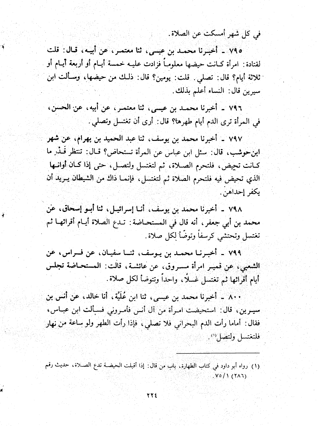 800 - أخبرنا محمد بن عيسى ثنا بن علية انا خالد عن أنس بن سيرين قال : استحيضت امرأة من آل أنس فأمروني فسألت بن عباس فقال أما ما رأت الدم البحراني فلا تصلي فإذا رأت الطهر ولو ساعة من نهار فلتغتسل ولتصل