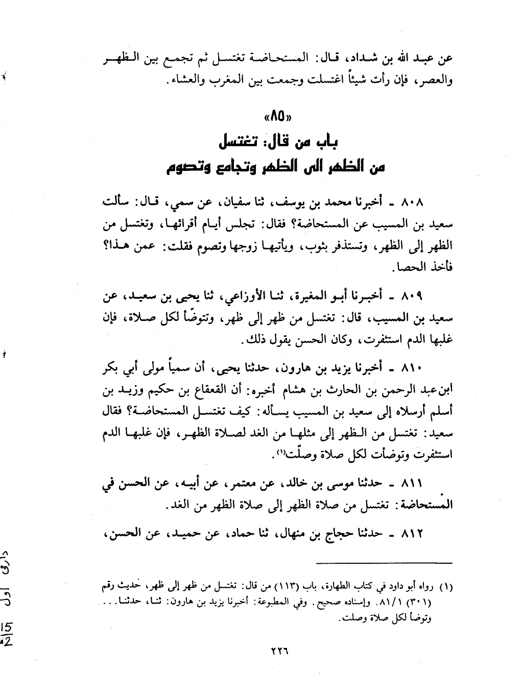 809 - أخبرنا أبو المغيرة ثنا الأوزاعي ثنا يحيى بن سعيد عن سعيد بن المسيب قال : تغتسل من ظهر إلى ظهر وتتوضأ لكل صلاة فإن غلبها الدم استثفرت وكان الحسن يقول ذلك