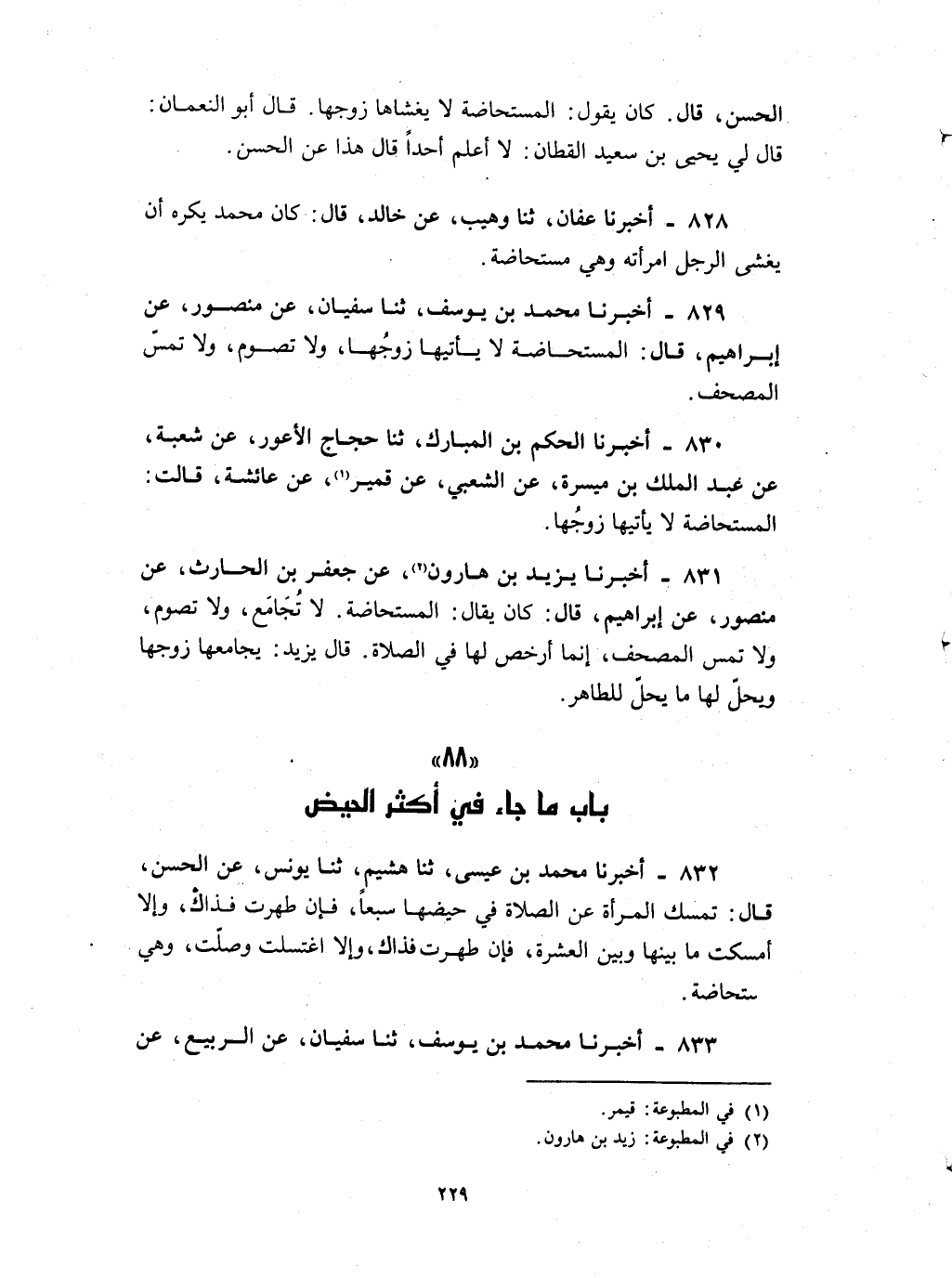 829 - أخبرنا محمد بن يوسف ثنا سفيان عن منصور عن إبراهيم قال : المستحاضة لا يأتيها زوجها ولا تصوم ولا تمس المصحف