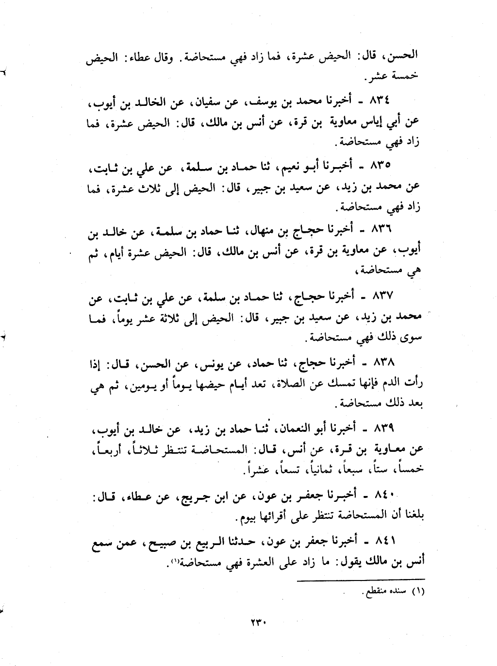 839 - أخبرنا أبو النعمان ثنا حماد بن زيد عن خالد بن أيوب عن معاوية بن قرة عن أنس قال : المستحاضة تنتظر ثلاثا أربعا خمسا ستا سبعا ثمانيا تسعا عشرا
