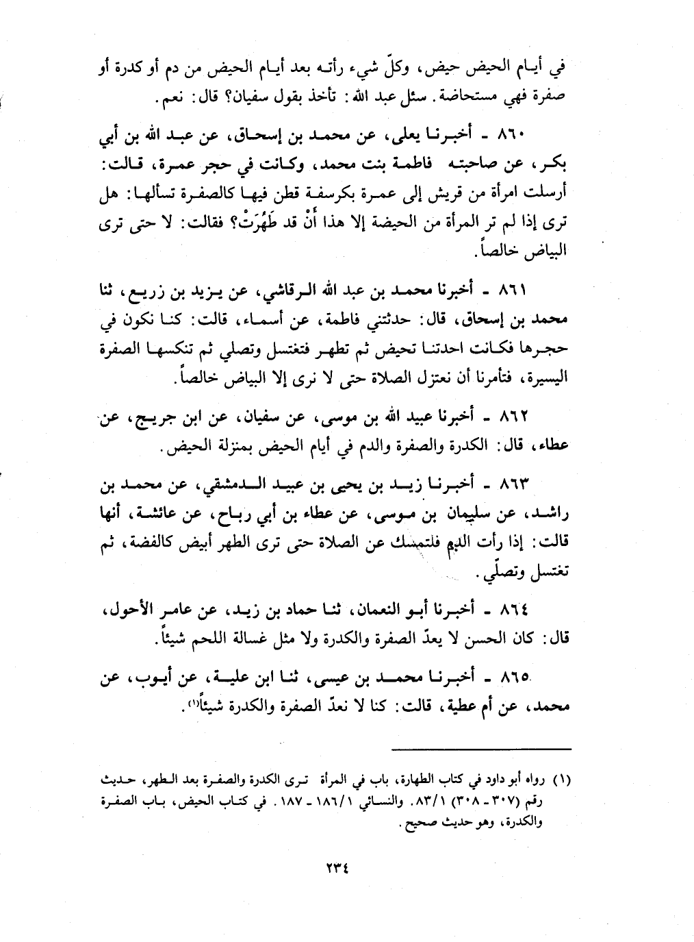 861 - أخبرنا محمد بن عبد الله الرقاشي عن يزيد بن زريع ثنا محمد بن إسحاق قال حدثتني فاطمة عن أسماء قالت : كنا نكون في حجرها فكانت أحدتنا تحيض ثم تطهر فتغتسل وتصلي ثم تنكسها الصفرة اليسيرة فتأمرنا ان نعتزل الصلاة حتى لا نرى الا البياض خالصا
