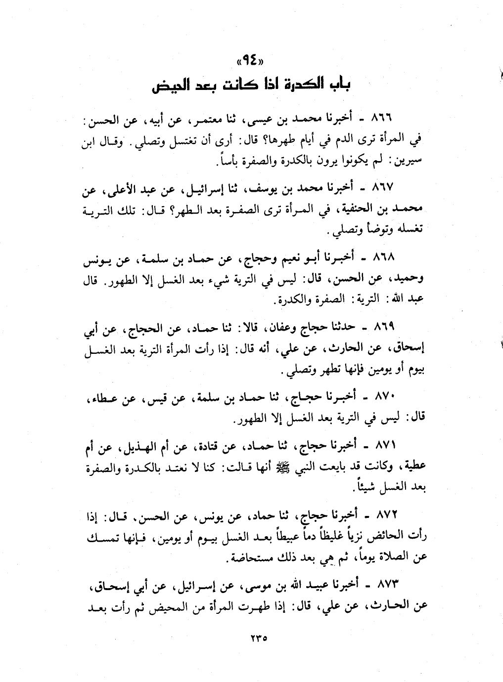 871 - أخبرنا حجاج ثنا حماد عن قتادة عن أم الهذيل عن أم عطية وكانت قد بايعت النبي صلى الله عليه و سلم انها قالت : كنا لا نعتد بالكدرة والصفرة بعد الغسل شيئا