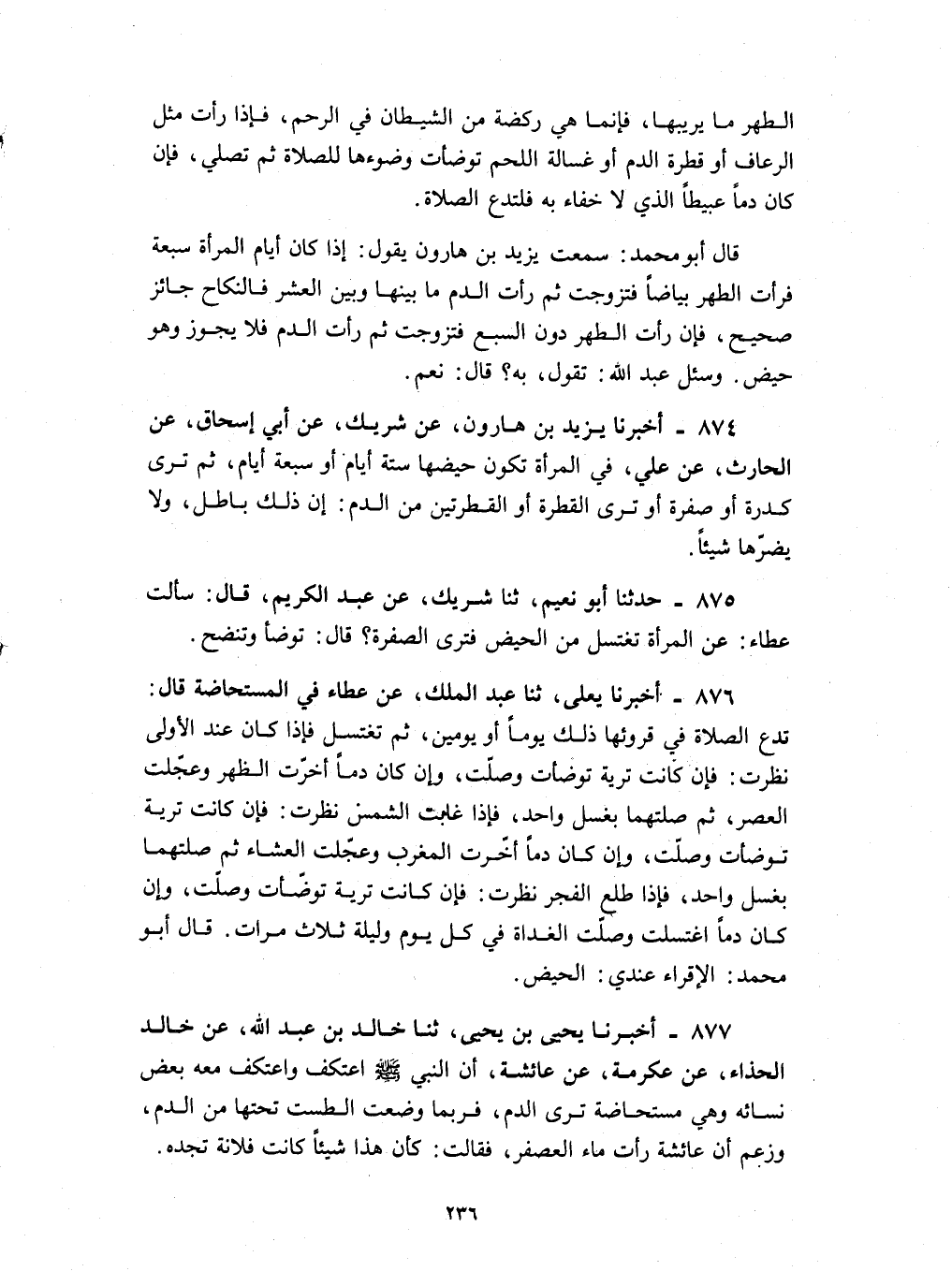 874 - أخبرنا يزيد بن هارون عن شريك عن أبي إسحاق عن الحارث عن علي في المرأة تكون حيضها ستة أيام أو سبعة أيام ثم ترى كدرة أو صفرة أو ترى القطرة أو القطرتين من الدم ان ذلك باطل ولا يضرها شيئا :