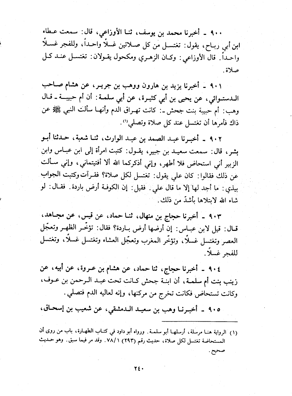 905 - أخبرنا وهب بن سعيد الدمشقي عن شعيب بن إسحاق حدثنا الأوزاعي قال سمعت الزهري ويحيى بن أبي كثير يقولان : تفرد لكل صلاة اغتساله قال الأوزاعي وبلغني عن مكحول مثل ذلك