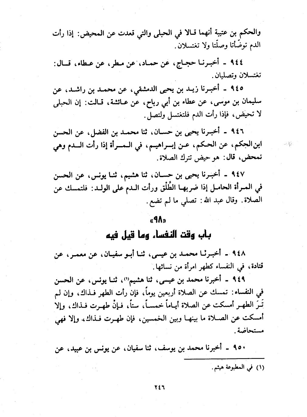 950 - أخبرنا محمد بن يوسف ثنا سفيان عن يونس بن عبيد عن الحسن عن عثمان بن أبي العاص : انه كان لا يقرب النفساء أربعين يوما وقال الحسن النفساء خمس وأربعون إلى خمسين فما زاد فهي مستحاضة