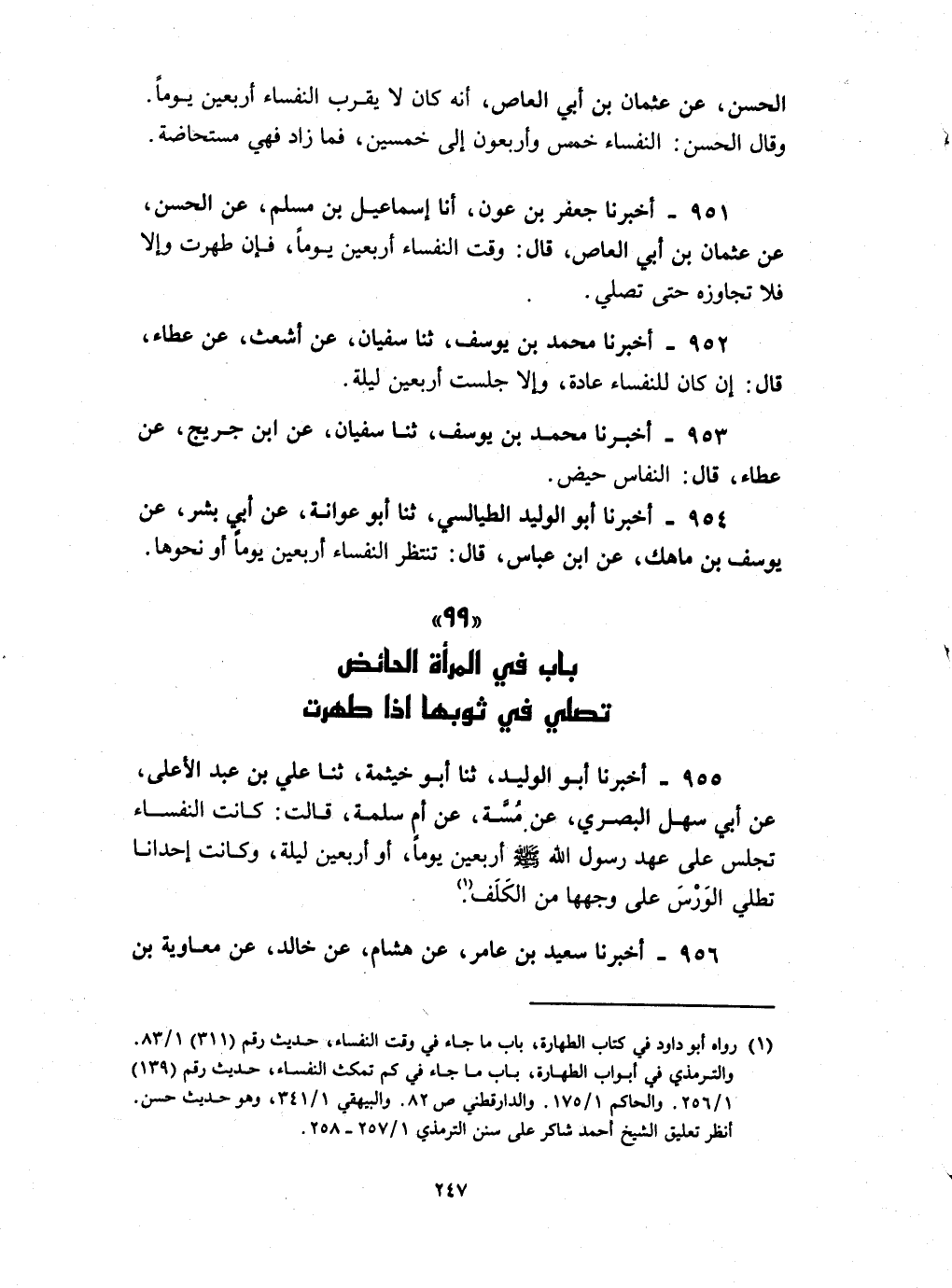 955 - أخبرنا أبو الوليد ثنا أبو خيثمة حدثنا علي بن عبد الأعلى عن أبي سهل البصري عن مسة عن أم سلمة قالت : كانت النفساء تجلس على عهد رسول الله صلى الله عليه و سلم أربعين يوما أو أربعين ليلة وكانت إحدانا تطلى الورس على وجهها من الكلف