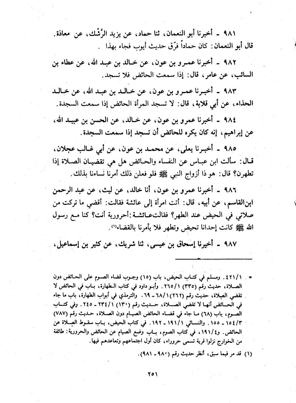 986 - أخبرنا عمرو بن عون انا خالد عن ليث عن عبد الرحمن بن القاسم عن أبيه قال : أتت امرأة إلى عائشة فقالت اقضي ما تركت من صلاتي في الحيض عند الطهر فقالت عائشة أحرورية أنت كنا مع رسول الله صلى الله عليه و سلم فكانت إحدانا تحيض وتطهر فلا يأمرنا بالقضاء