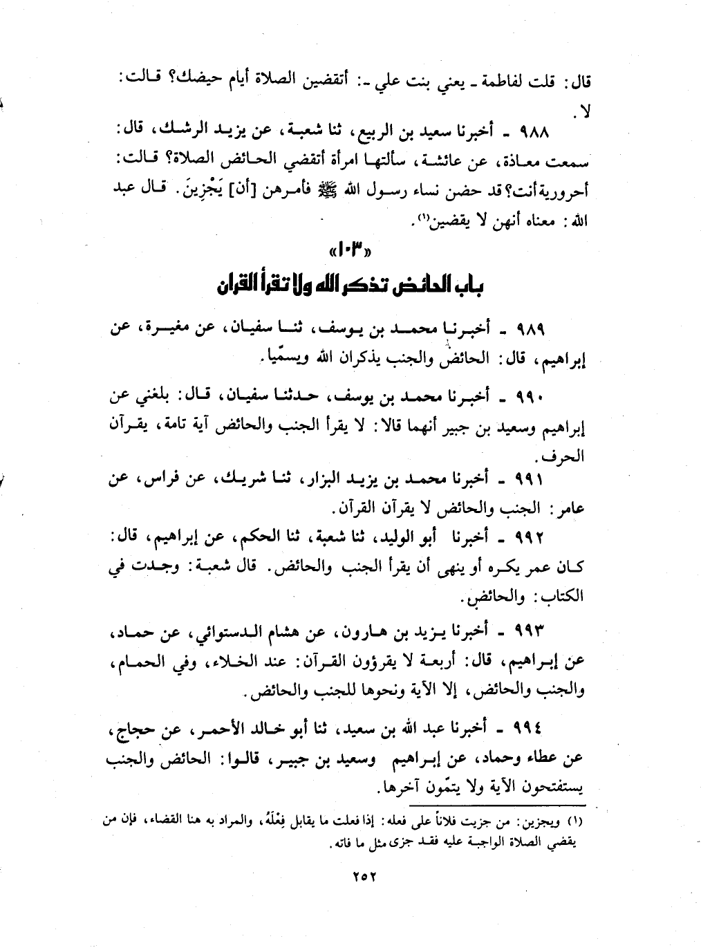 993 - أخبرنا يزيد بن هارون عن هشام الدستوائي عن حماد عن إبراهيم قال : أربعة لا يقرؤون القرآن عند الخلاء وفي الحمام والجنب والحائض الا الآية ونحوها للجنب والحائض
