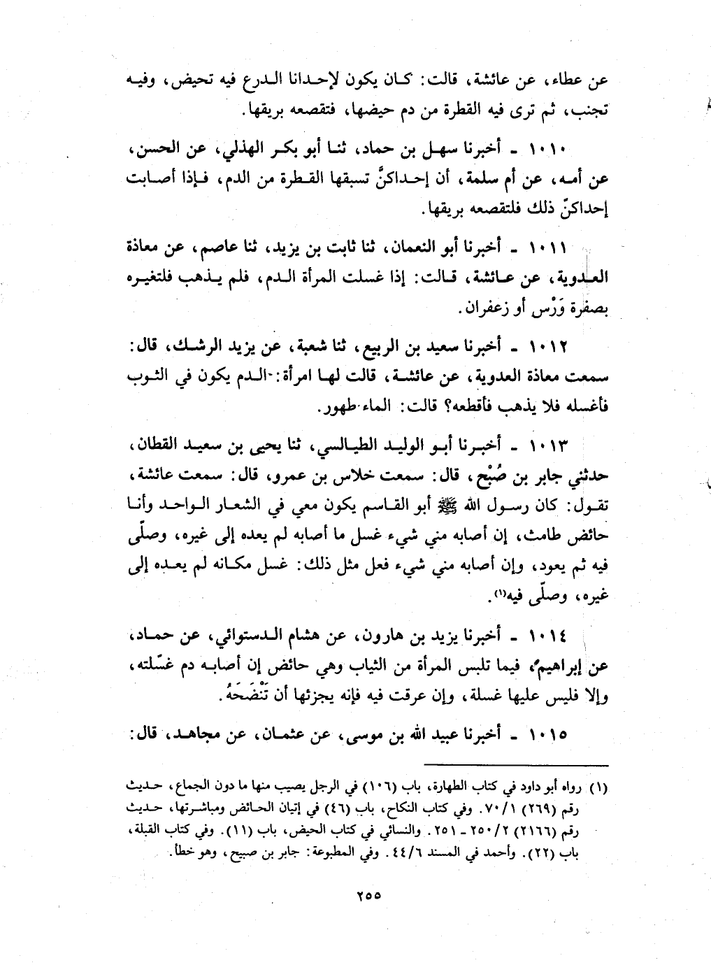 1010 - أخبرنا سهل بن حماد ثنا أبو بكر الهذلي عن الحسن عن أمه عن أم سلمة : ان إحداكن تسبقها القطرة من الدم فإذا أصابت إحداكن ذلك فلتقصعه بريقها