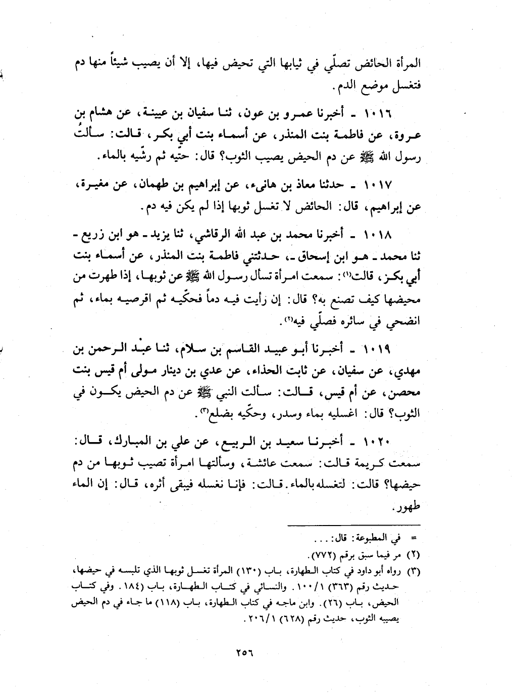 1020 - أخبرنا سعيد بن الربيع عن علي بن المبارك قال سمعت كريمة قالت : سمعت عائشة وسألتها امرأة تصيب ثوبها من دم حيضها قالت لتغسله بالماء قالت فإنا نغسله فيبقى أثره قالت ان الماء طهور
