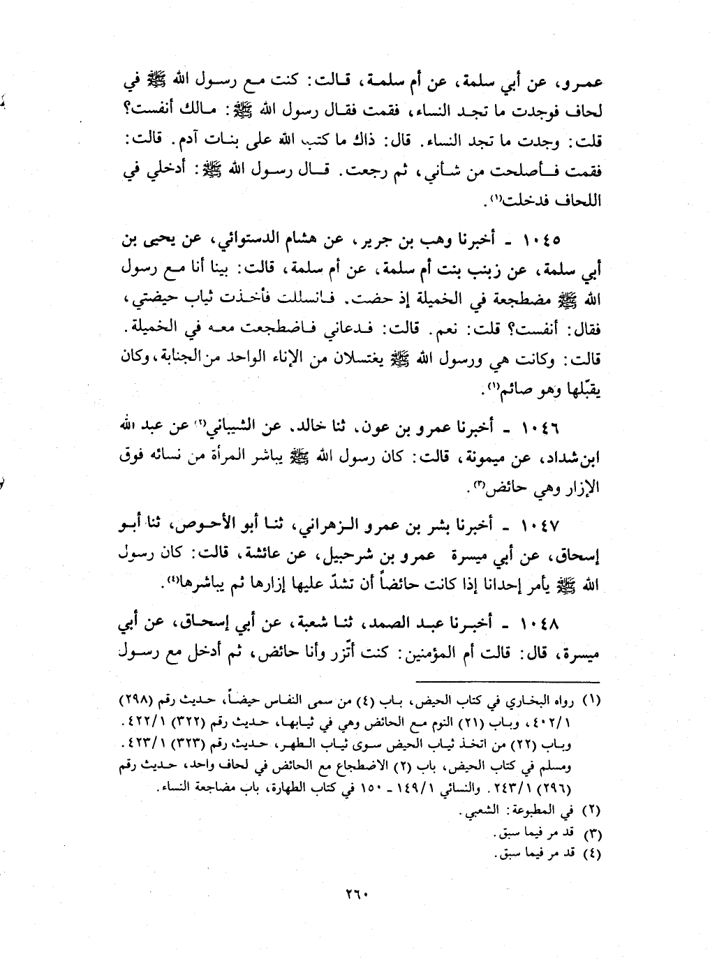 1046 - أخبرنا عمرو بن عون ثنا خالد عن الشيباني عن عبد الله بن شداد عن ميمونة قالت : كان رسول الله صلى الله عليه و سلم يباشر المرأة من نسائه فوق الإزار وهي حائض