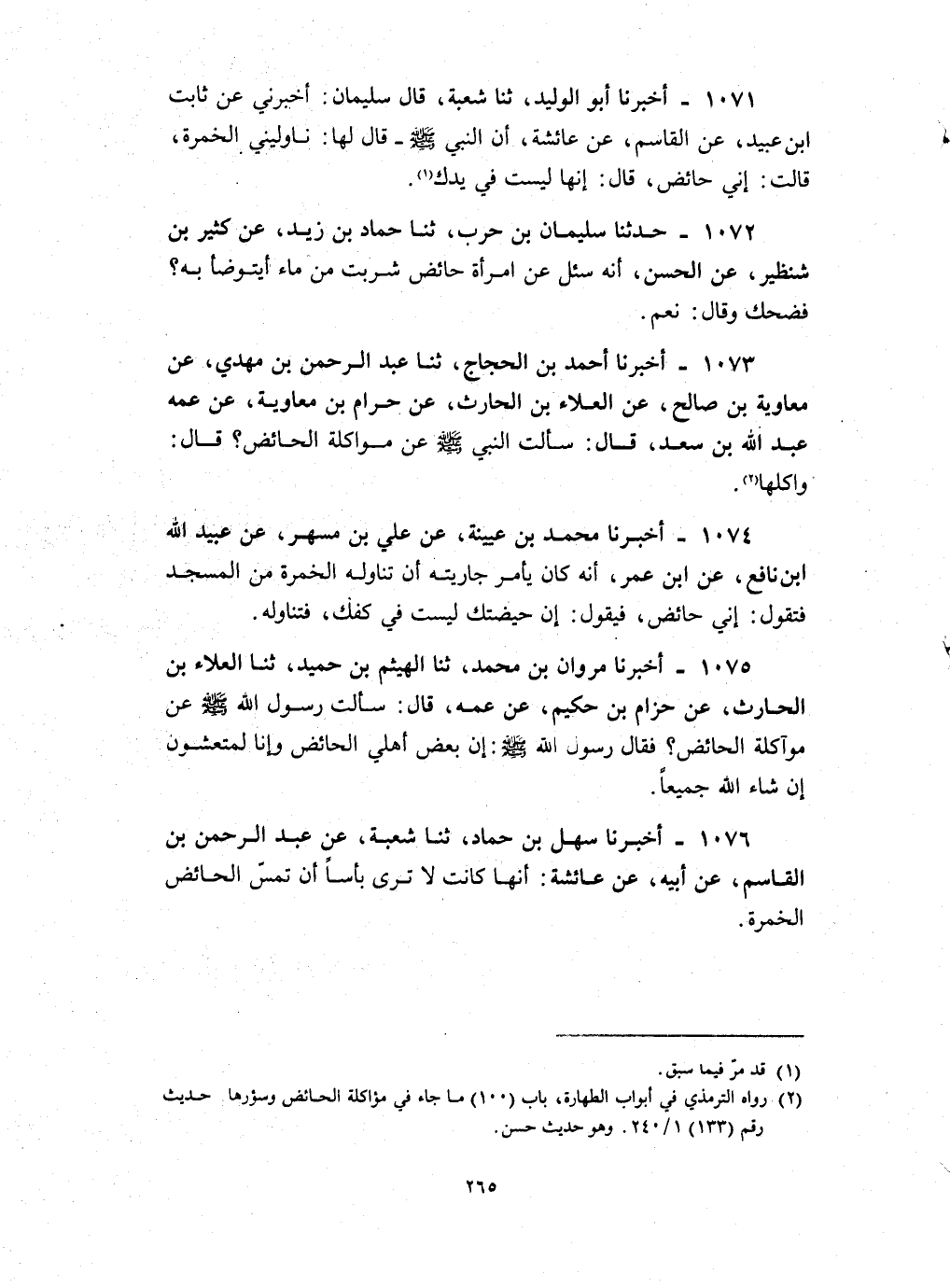 1071 - أخبرنا أبو الوليد ثنا شعبة قال سليمان أخبرني عن ثابت بن عبيد عن القاسم عن عائشة : ان النبي صلى الله عليه و سلم قال لها ناوليني الخمرة قالت اني حائض قال إنها ليست في يدك