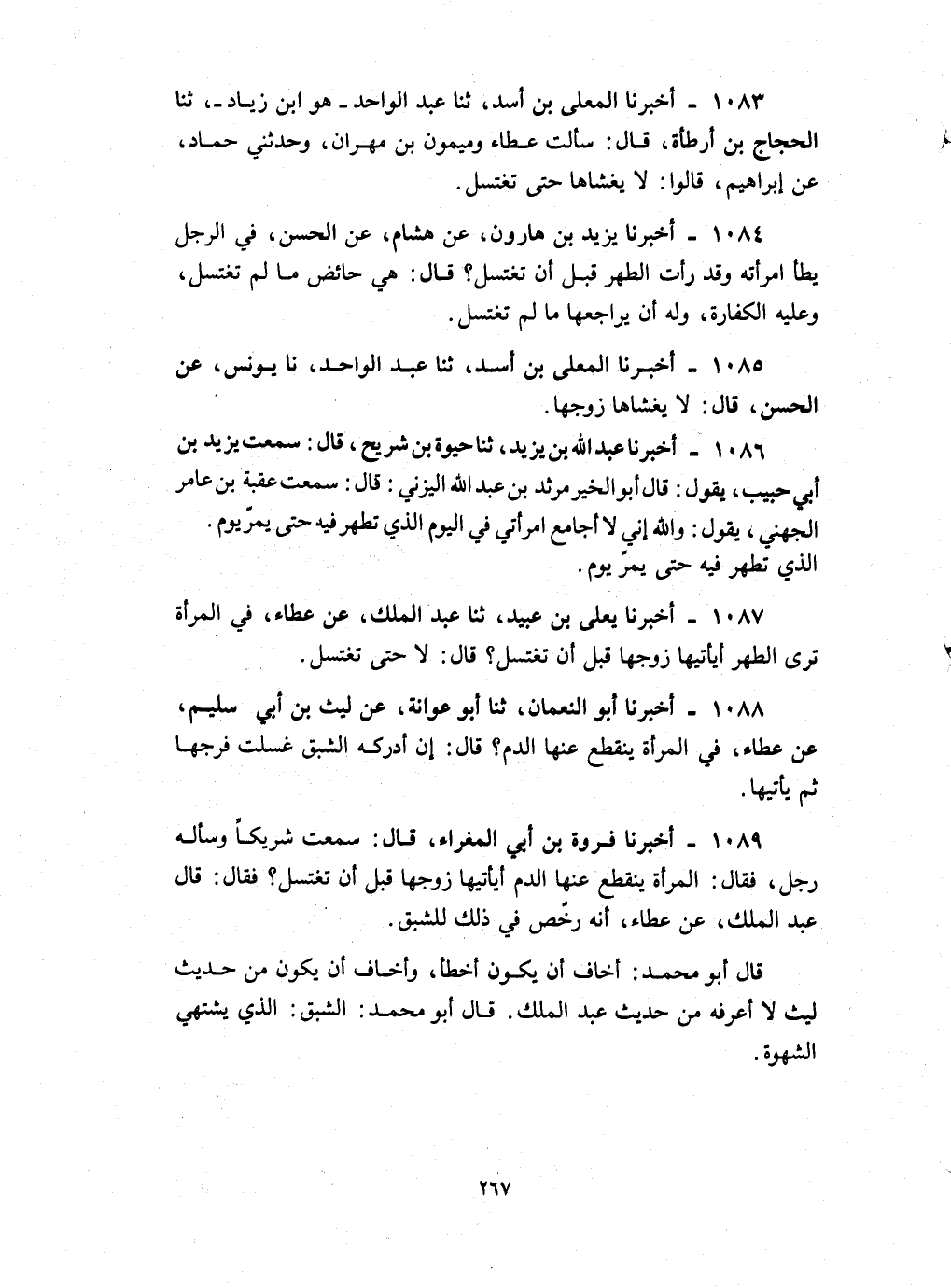 1088 - أخبرنا أبو النعمان ثنا أبو عوانة عن ليث بن أبي سليم عن عطاء : في المرأة ينقطع عنها الدم قال ان أدركه الشبق غسلت فرجها ثم يأتيها