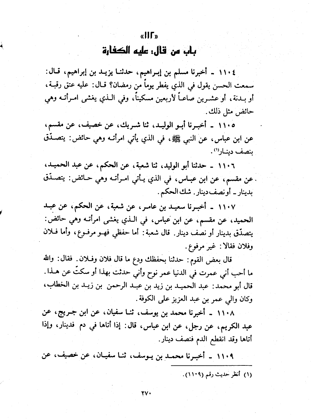 1109 - أخبرنا محمد بن يوسف ثنا سفيان عن خصيف عن مقسم عن بن عباس قال قال النبي صلى الله عليه و سلم : في الذي يقع على امرأته وهي حائض يتصدق بنصف دينار