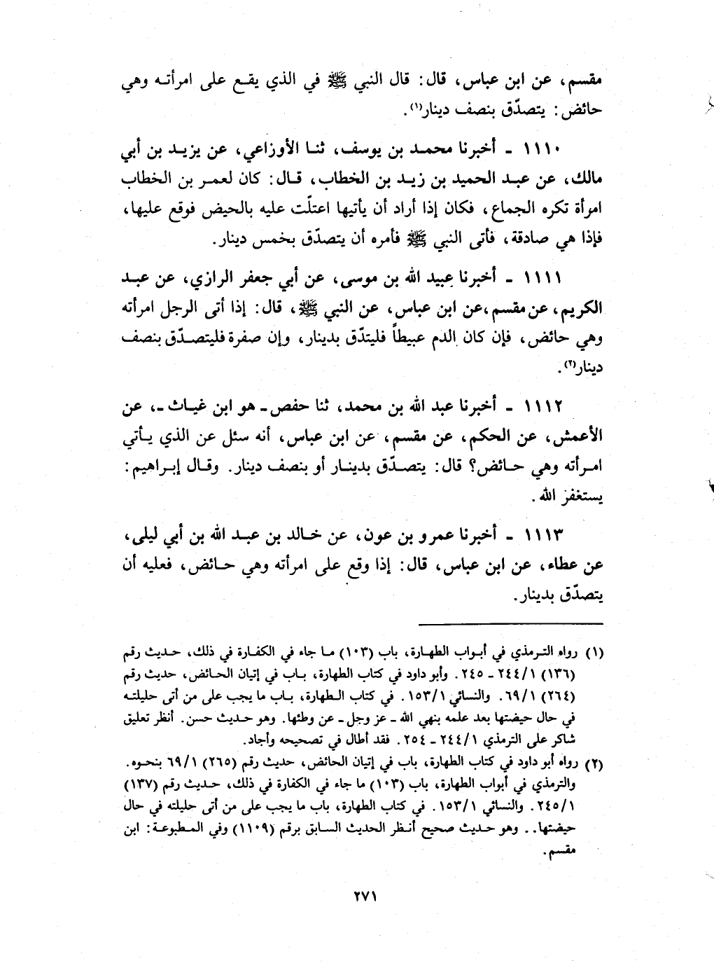 1113 - أخبرنا عمرو بن عون عن خالد بن عبد الله بن أبي ليلى عن عطاء عن بن عباس قال : إذا وقع على امرأته وهي حائض فعليه أن يتصدق بدينار