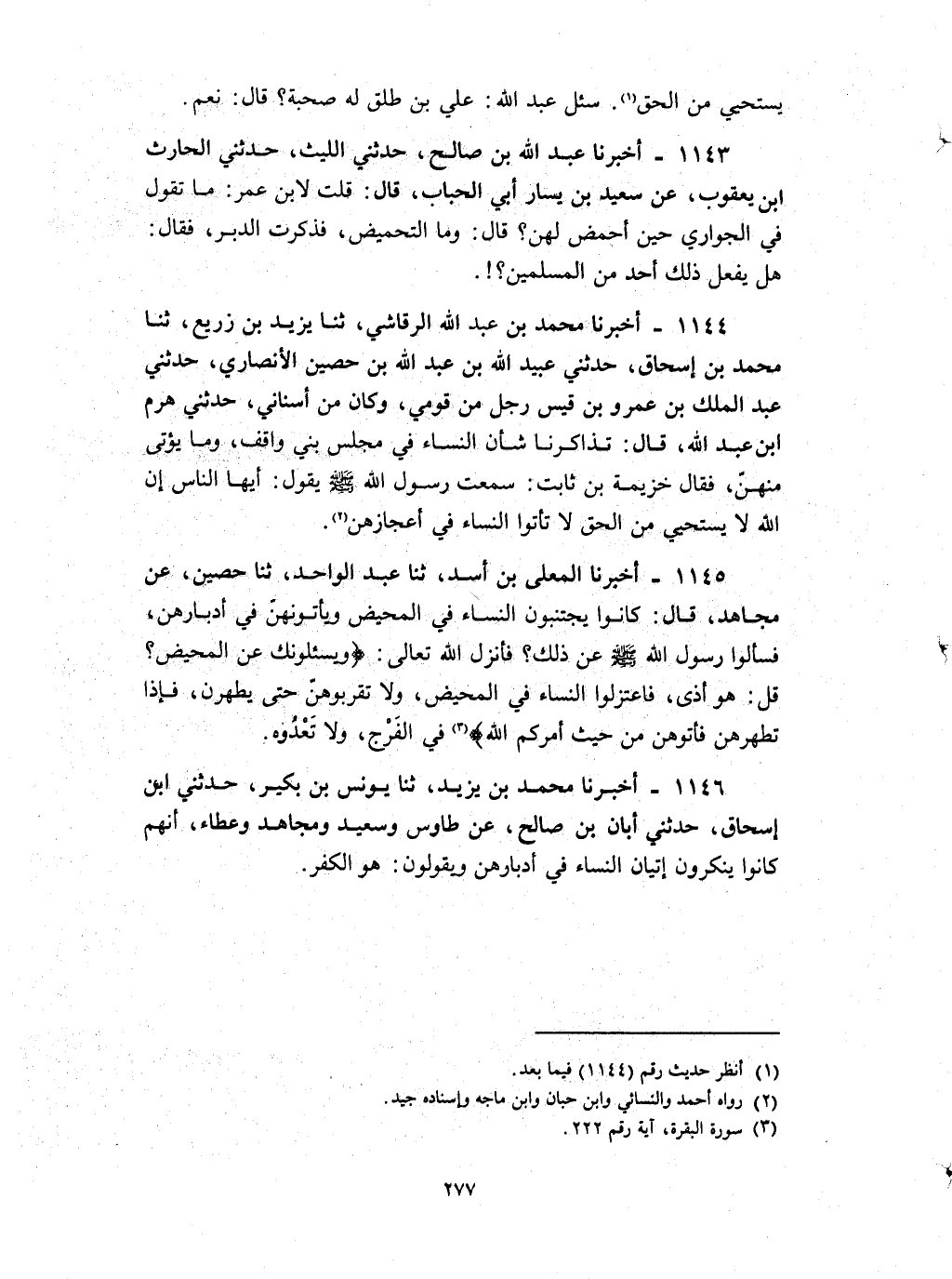 1144 - أخبرنا محمد بن عبد الله الرقاشي ثنا يزيد بن زريع ثنا محمد بن إسحاق حدثني عبيد الله بن عبد الله بن حصين الأنصاري حدثني عبد الملك بن عمرو بن قيس رجل من قومي وكان من أسناني حدثني هرم بن عبد الله قال تذاكرنا شأن النساء في مجلس بني واقف وما يؤتى منهن فقال خزيمة بن ثابت سمعت رسول الله صلى الله عليه و سلم يقول : أيها الناس ان الله لا يستحيي من الحق لا تأتوا النساء في أعجازهن
