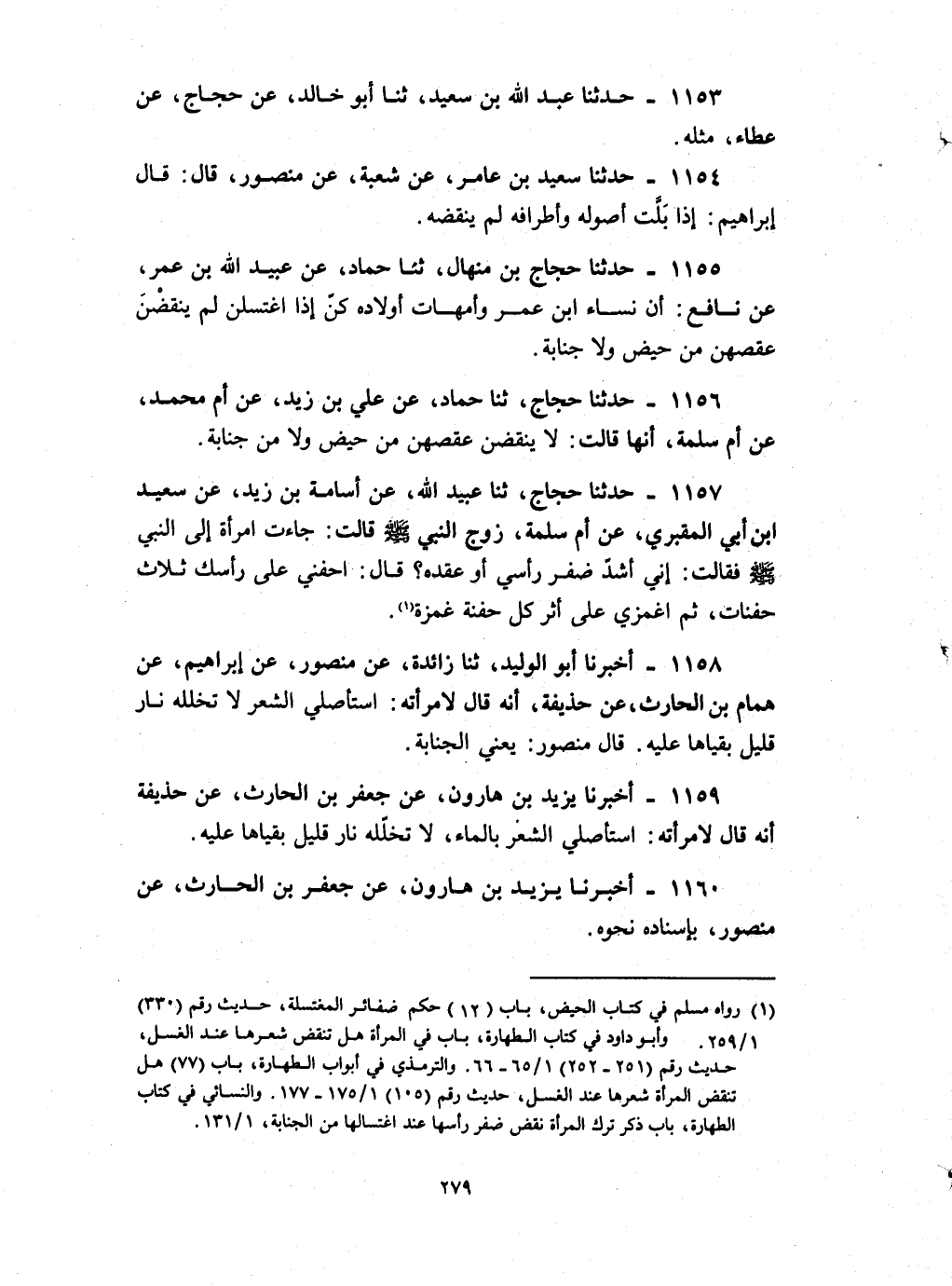 1155 - حدثنا حجاج بن منهال ثنا حماد عن عبيد الله بن عمر عن نافع : ان نساء بن عمر وأمهات أولاده كن إذا اغتسلن لم ينقضن عقصهن من حيض ولا جنابة