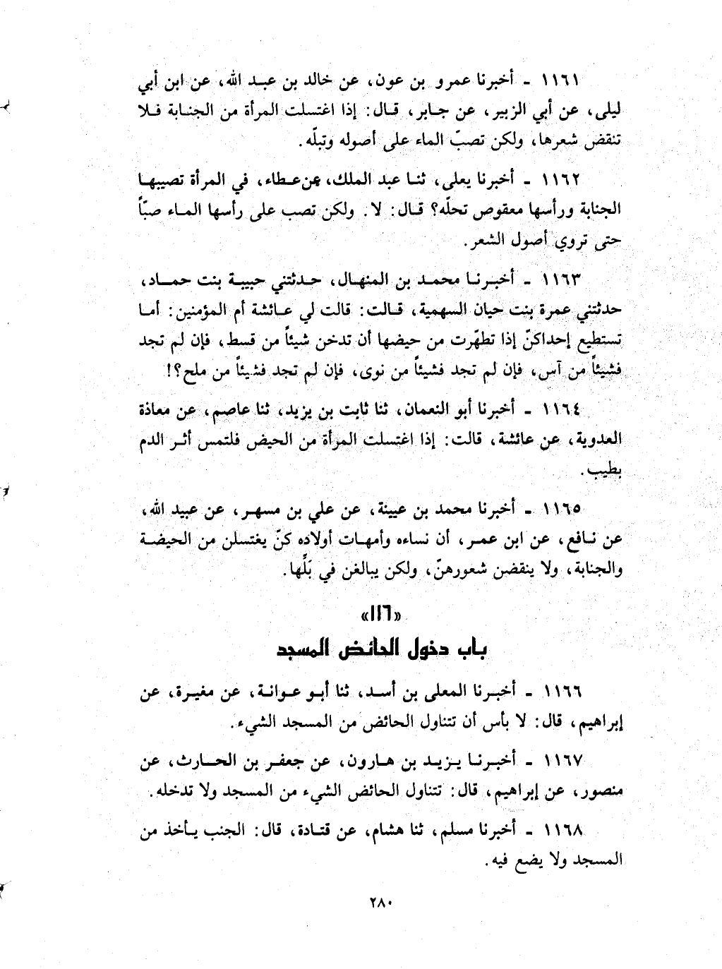 1165 - أخبرنا محمد بن عيينة عن علي بن مسهر عن عبيد الله عن نافع عن بن عمر : ان نساءه وأمهات أولاده كن يغتسلن من الحيضة والجنابة ولا ينقضن شعورهن ولكن يبالغن في بلها