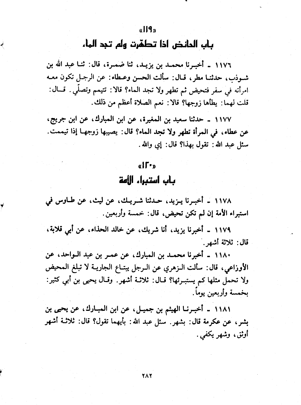 1176 - أخبرنا محمد بن يزيد ثنا ضمرة قال ثنا عبد الله بن شوذب حدثنا مطر قال : سألت الحسن وعطاء عن الرجل تكون معه امرأته في سفر فتحيض ثم تطهر ولا تجد الماء قالا تتيمم وتصلي قال قلت لهما يطأها زوجها قالا نعم الصلاة أعظم من ذلك