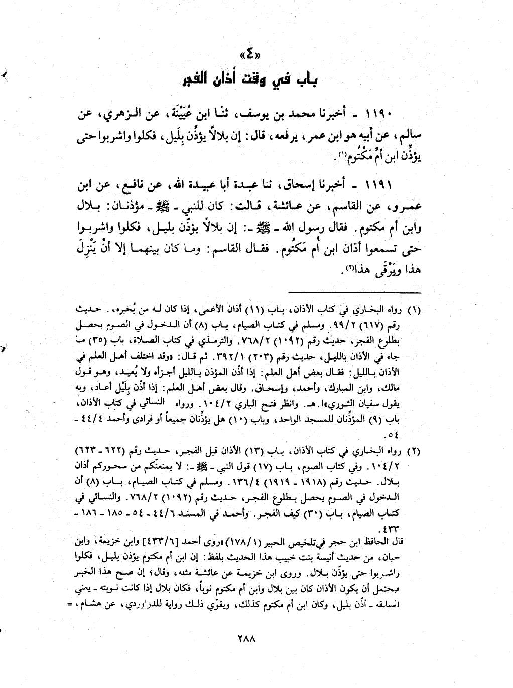 1190 - أخبرنا محمد بن يوسف ثنا بن عيينة عن الزهري عن سالم عن أبيه هو بن عمر يرفعه قال : ان بلالا يؤذن بليل فكلوا واشربوا حتى يؤذن بن أم مكتوم