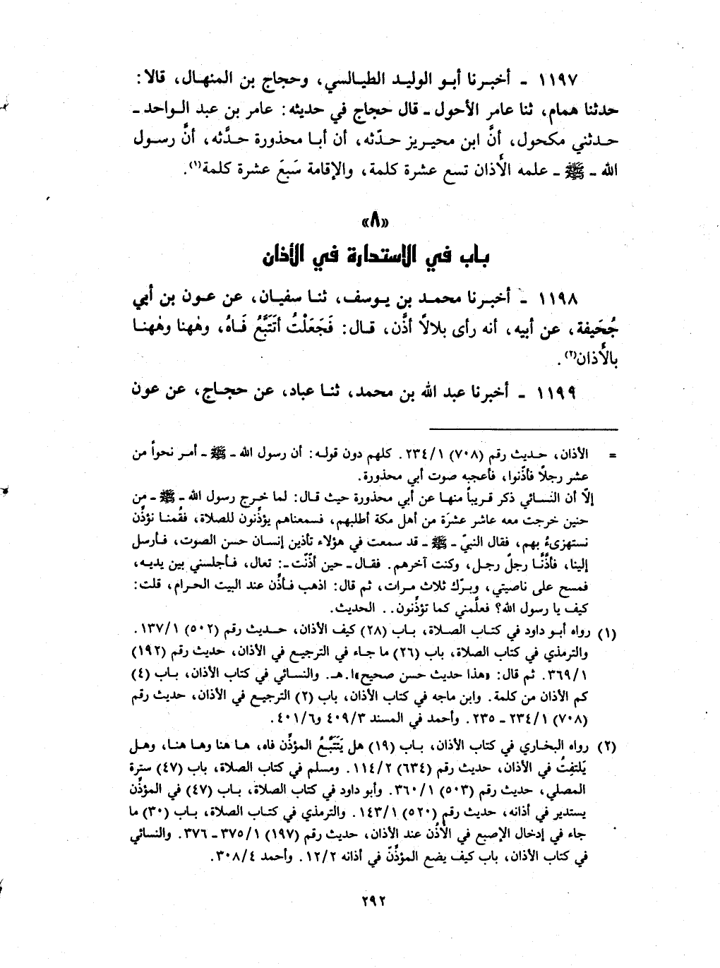 1198 - أخبرنا محمد بن يوسف ثنا سفيان عن عون بن أبي جحيفة عن أبيه : انه رأى بلالا أذن قال فجعلت أتتبع فاه ها هنا وههنا بالأذان