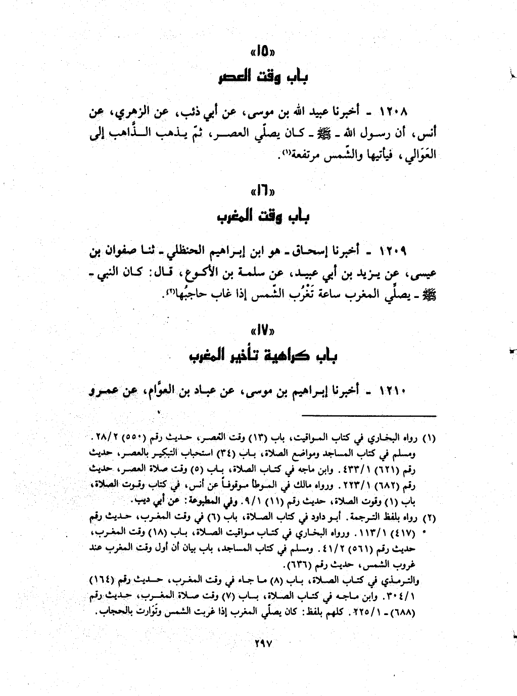 1208 - أخبرنا عبيد الله بن موسى عن أبي ذئب عن الزهري عن أنس : ان رسول الله صلى الله عليه و سلم كان يصلي العصر ثم يذهب الذاهب إلى العوالي فيأتيها والشمس مرتفعة
