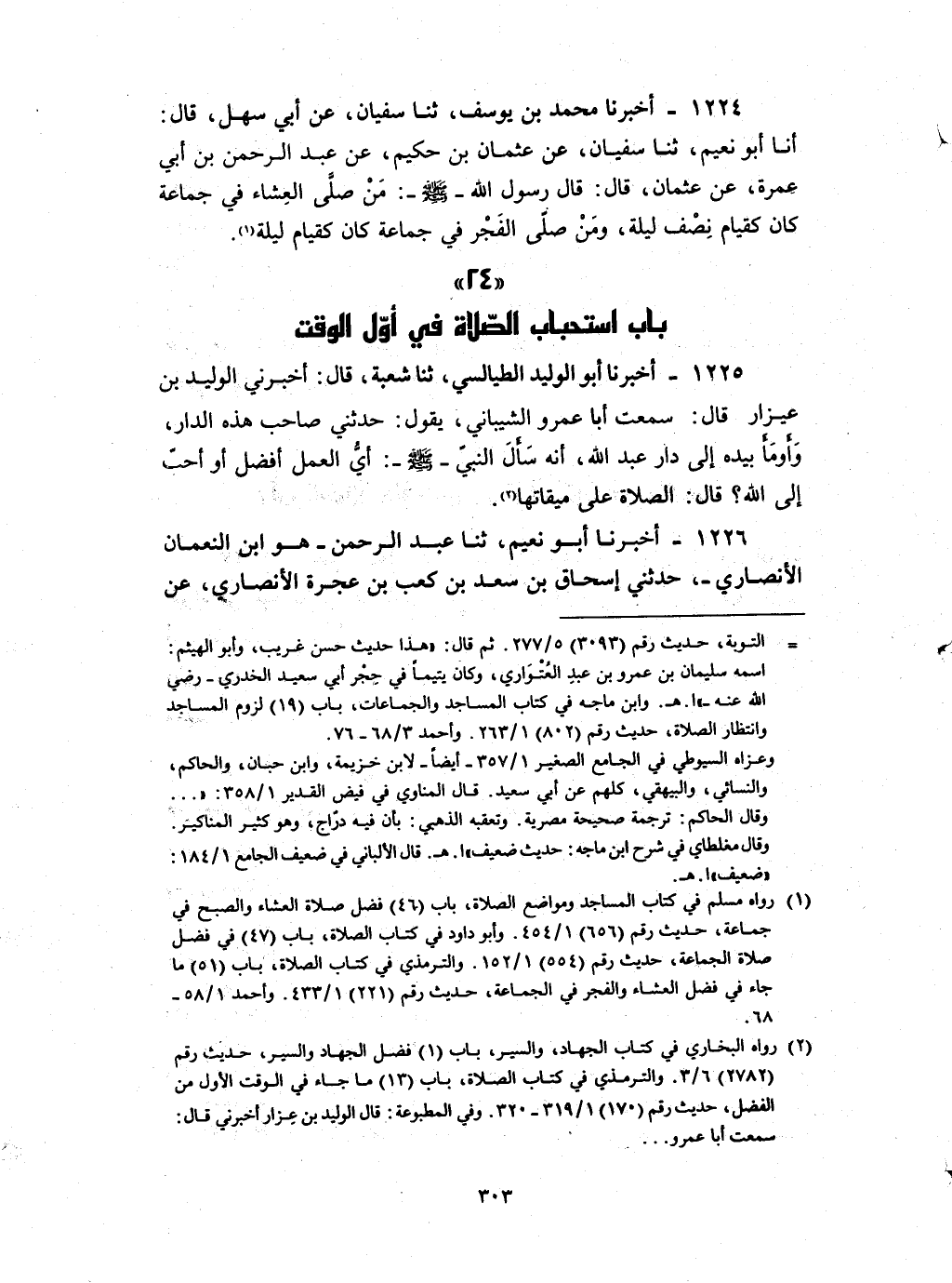 1224 - أخبرنا محمد بن يوسف ثنا سفيان عن أبي سهل قال انا أبو نعيم ثنا سفيان عن عثمان بن حكيم عن عبد الرحمن بن أبي عمرة عن عثمان قال قال رسول الله صلى الله عليه و سلم : من صلى العشاء في جماعة كان كقيام نصف ليلة ومن صلى الفجر في جماعة كان كقيام ليلة