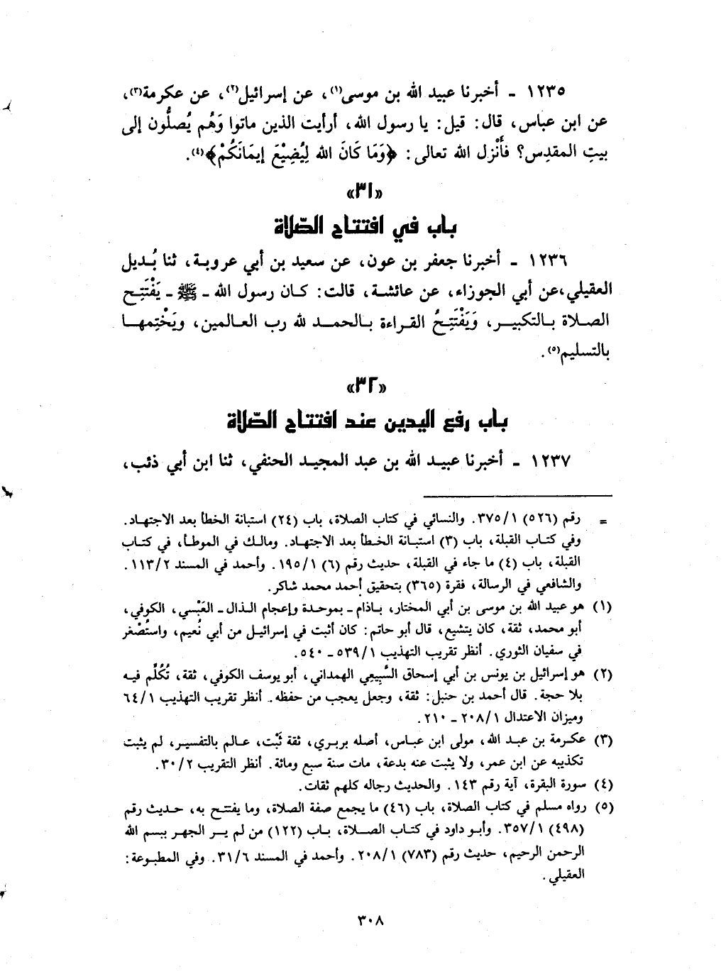 1235 - أخبرنا عبيد الله بن موسى عن إسرائيل عن عكرمة عن بن عباس قال : قيل يا رسول الله أرأيت الذين ماتوا وهم يصلون إلى بيت المقدس فأنزل الله تعالى { وما كان الله ليضيع إيمانكم