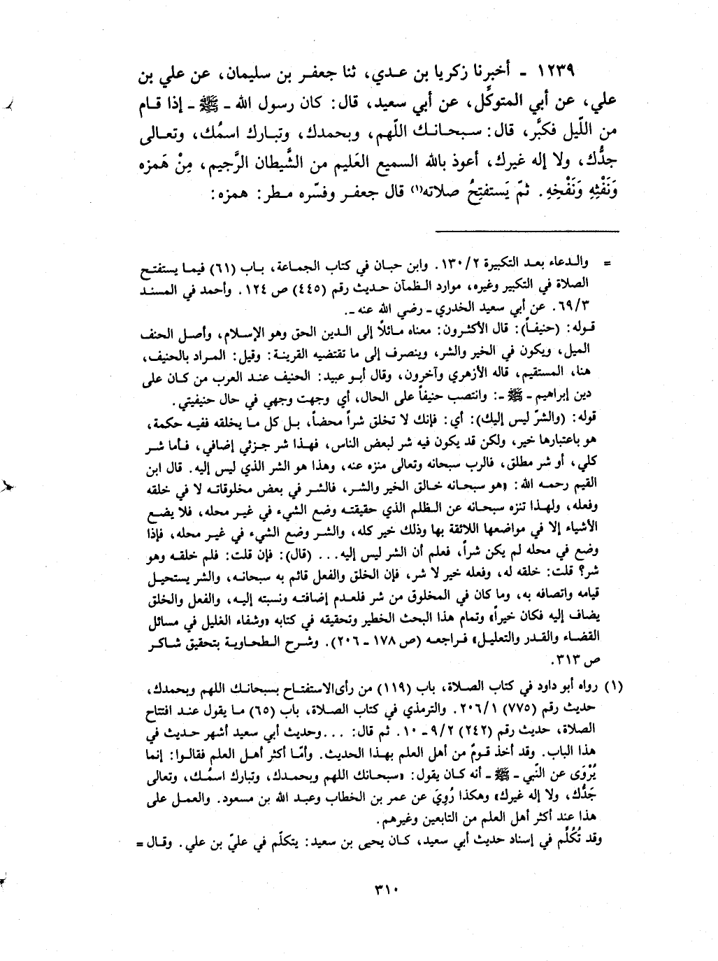 1239 - أخبرنا زكريا بن عدي ثنا جعفر بن سليمان عن علي بن علي عن أبي المتوكل عن أبي سعيد قال : كان رسول الله صلى الله عليه و سلم إذا قام من الليل فكبر قال سبحانك اللهم وبحمدك وتبارك اسمك وتعالى جدك ولا إله غيرك أعوذ بالله السميع العليم من الشيطان الرجيم من همزه ونفثه ونفخه ثم يستفتح صلاته قال جعفر وفسره مطر همزه المؤتة ونفثه الشعر ونفخه الكبر