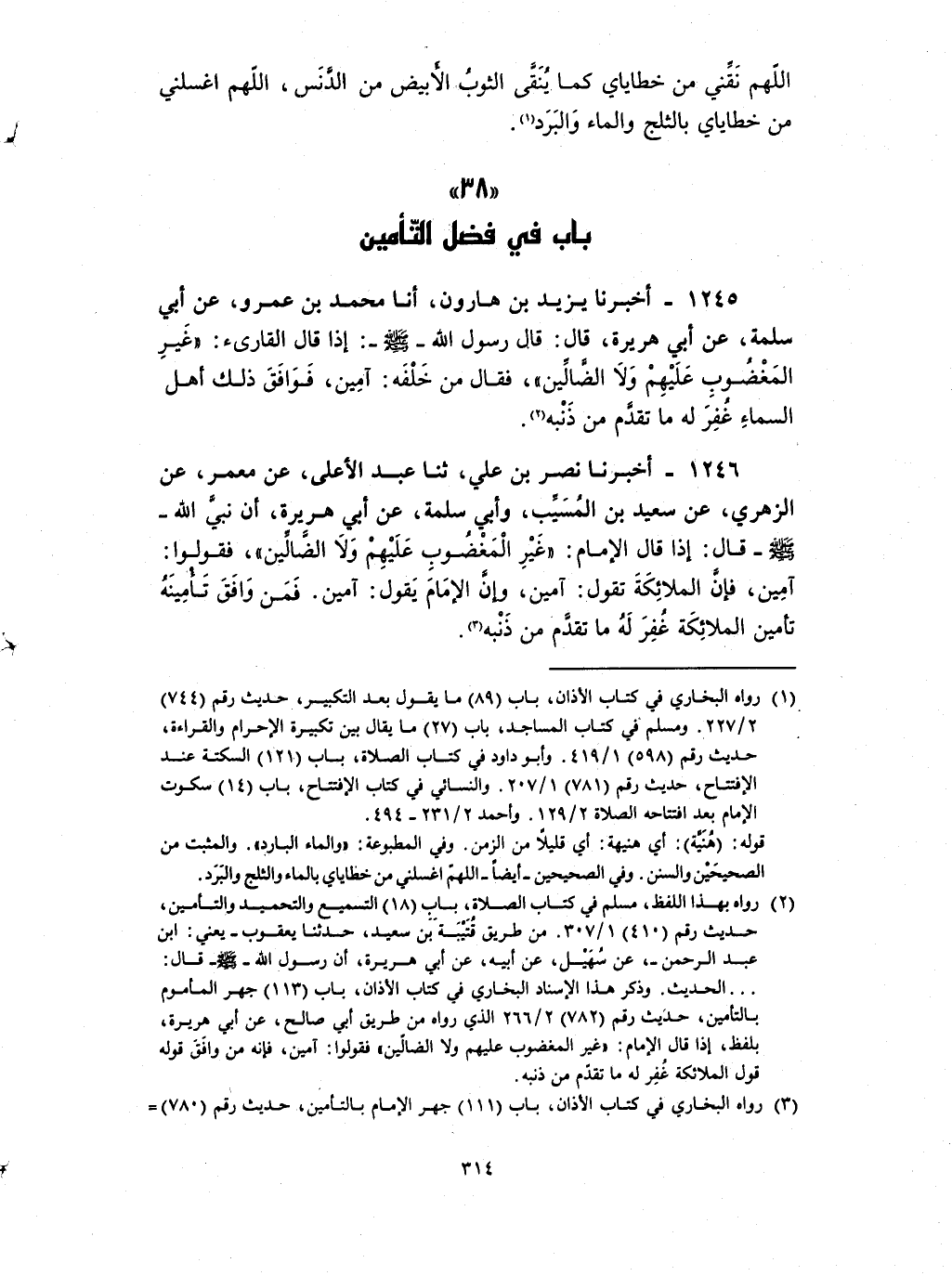 1246 - أخبرنا نصر بن علي ثنا عبد الأعلى عن معمر عن الزهري عن سعيد بن المسيب وأبي سلمة عن أبي هريرة ان نبي الله صلى الله عليه و سلم قال : إذا قال الإمام { غير المغضوب عليهم ولا الضالين } فقولوا أمين فإن الملائكة تقول أمين وان الإمام يقول أمين فمن وافق تأمينه تأمين الملائكة غفر له ما تقدم من ذنبه