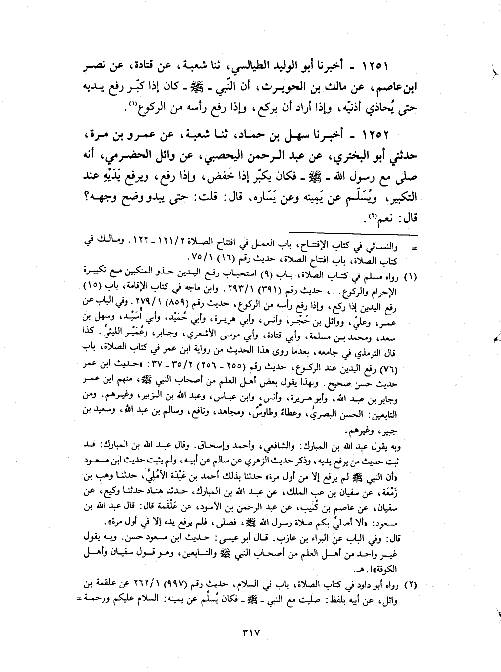 1251 - أخبرنا أبو الوليد الطيالسي ثنا شعبة عن قتادة عن نصر بن عاصم عن مالك بن الحويرث : ان النبي صلى الله عليه و سلم كان إذا كبر رفع يديه حتى يحاذي أذنيه وإذا أراد ان يركع وإذا رفع رأسه من الركوع