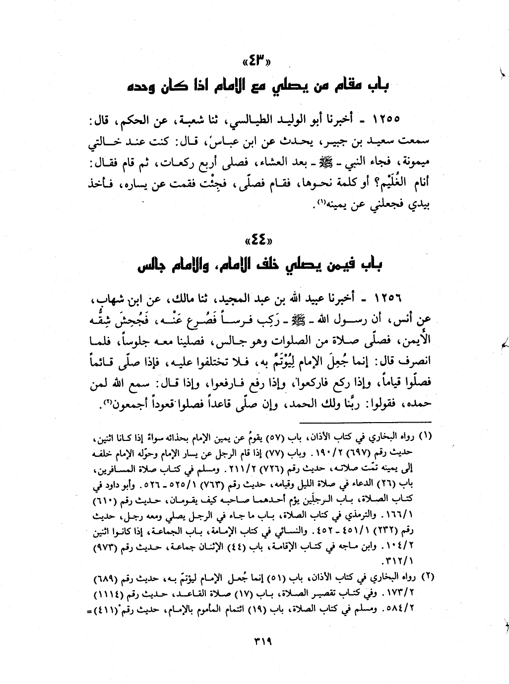 ( 43 باب مقام من يصلي مع الإمام إذا كان وحده )